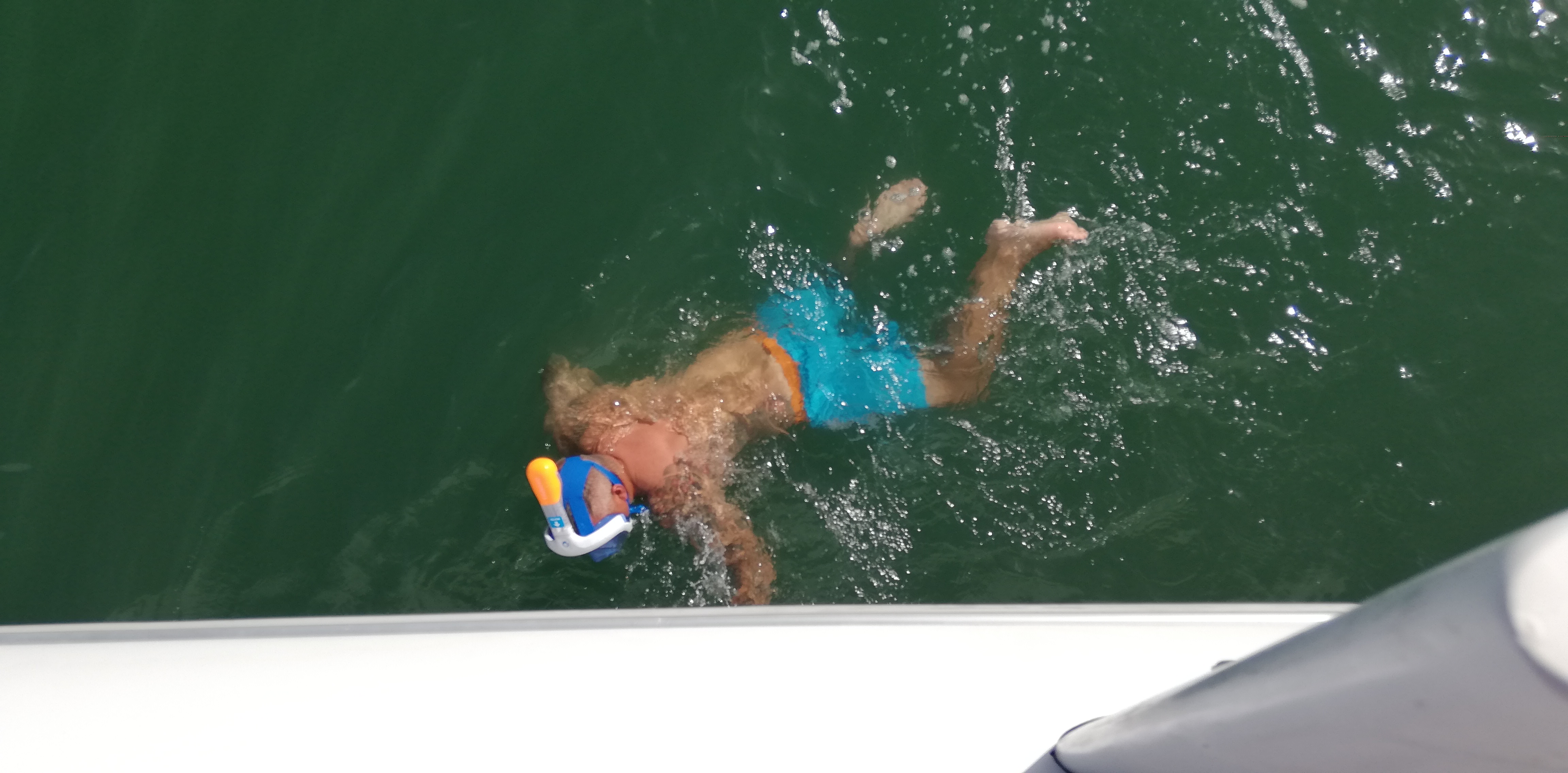 Unser einheimischer Schwimmer versucht mich für „seinen“ Ankerplatz zu begeistern