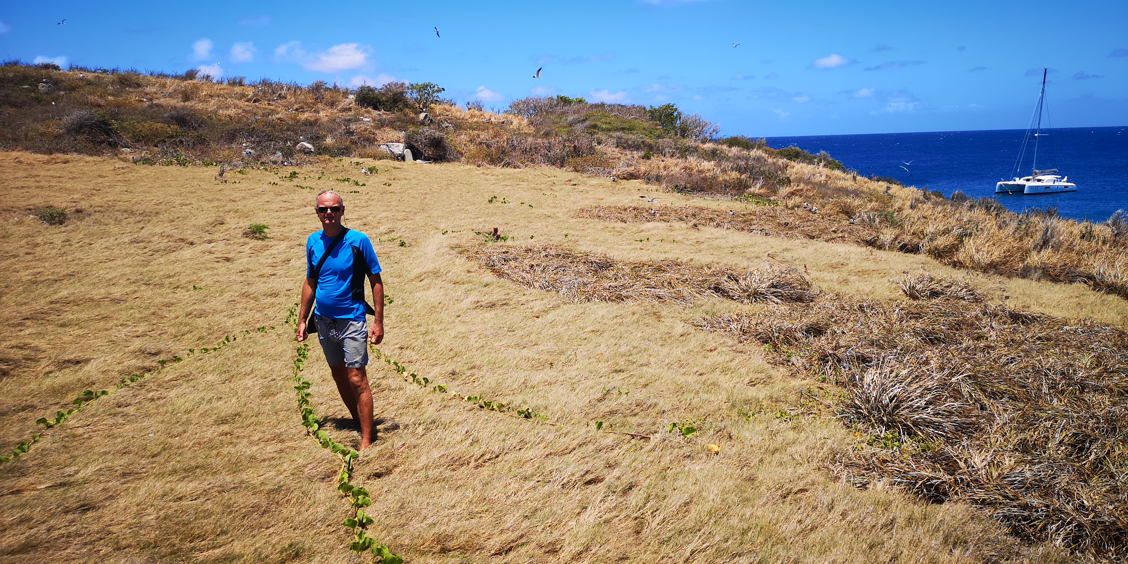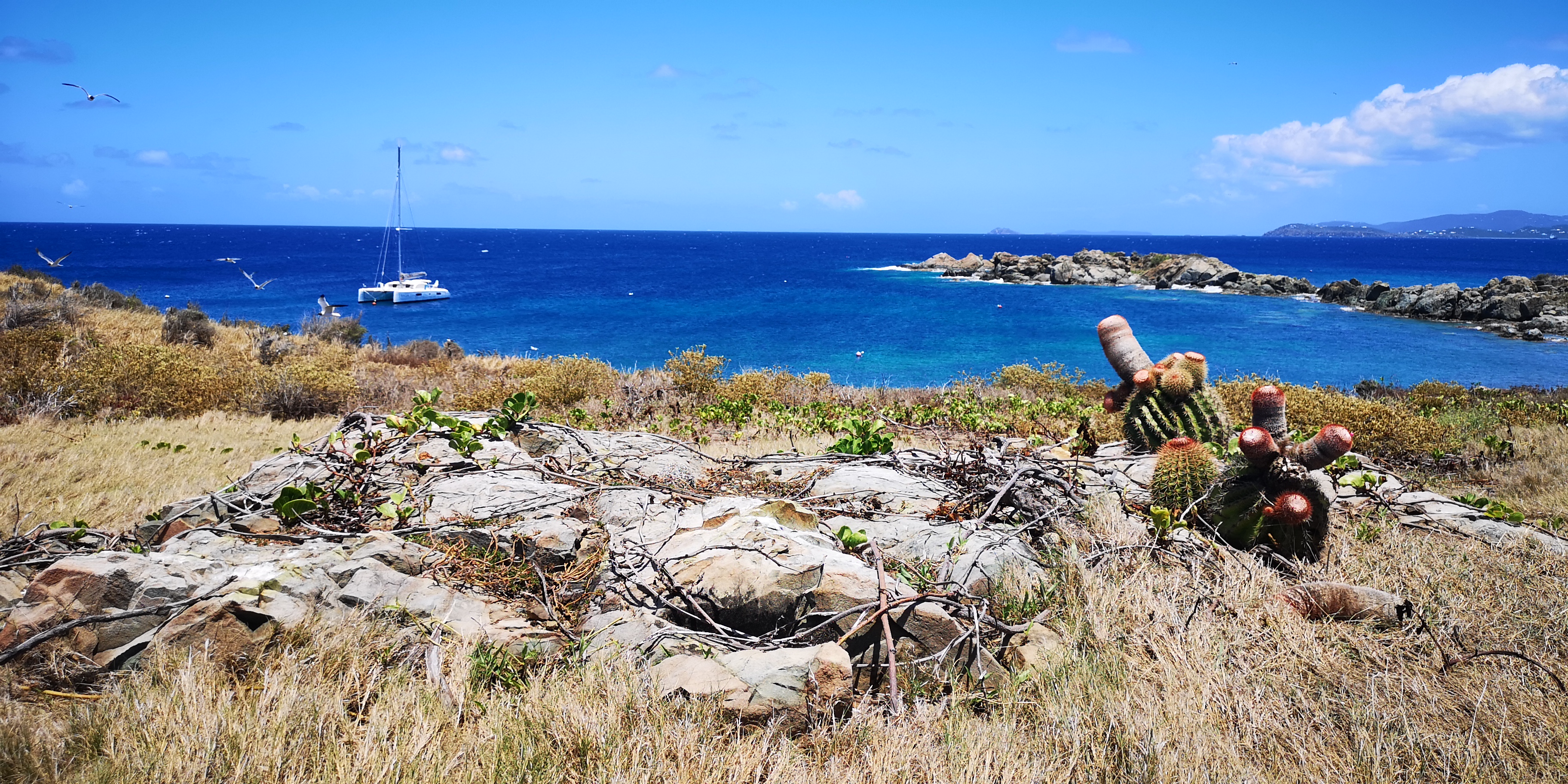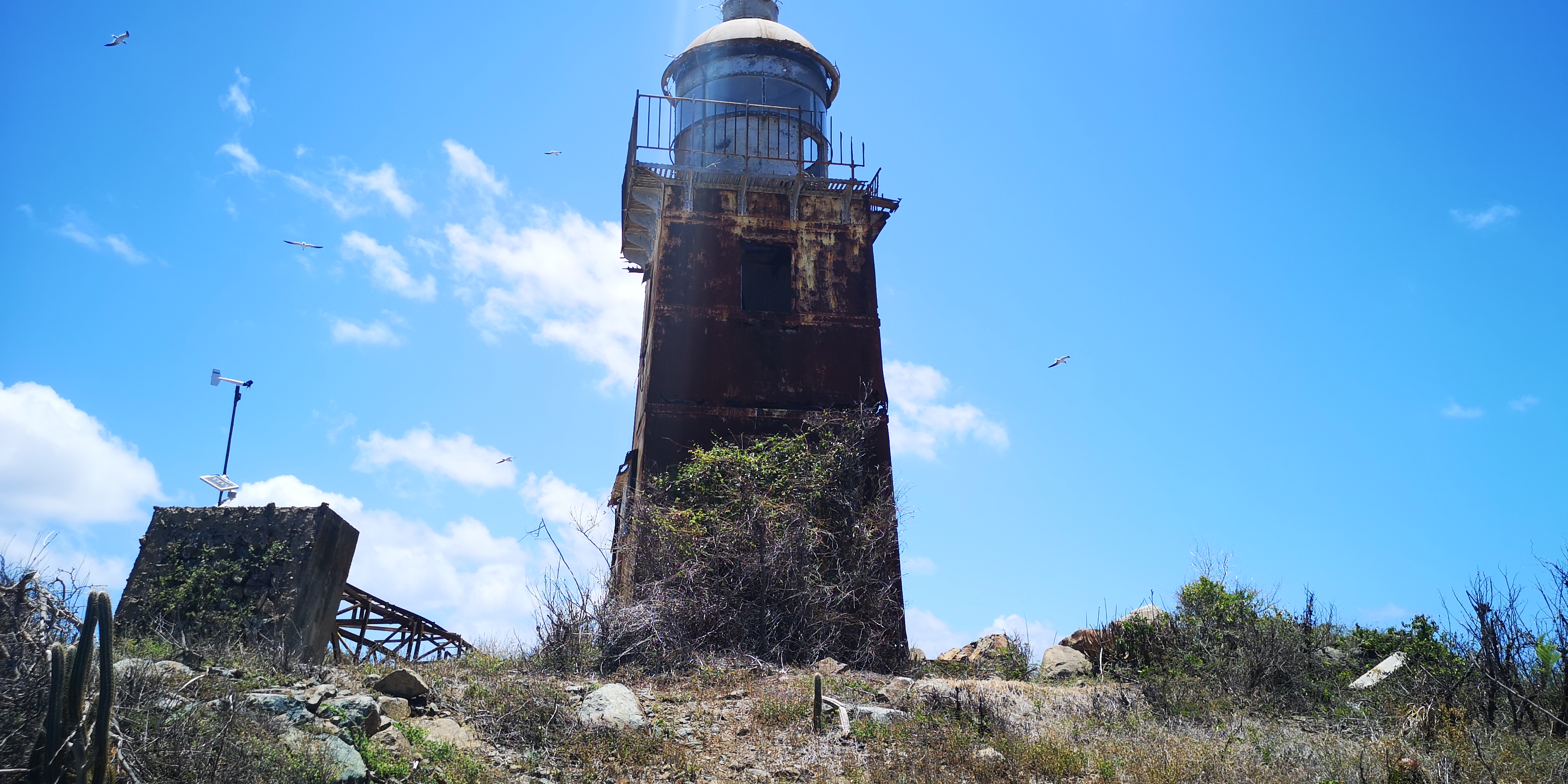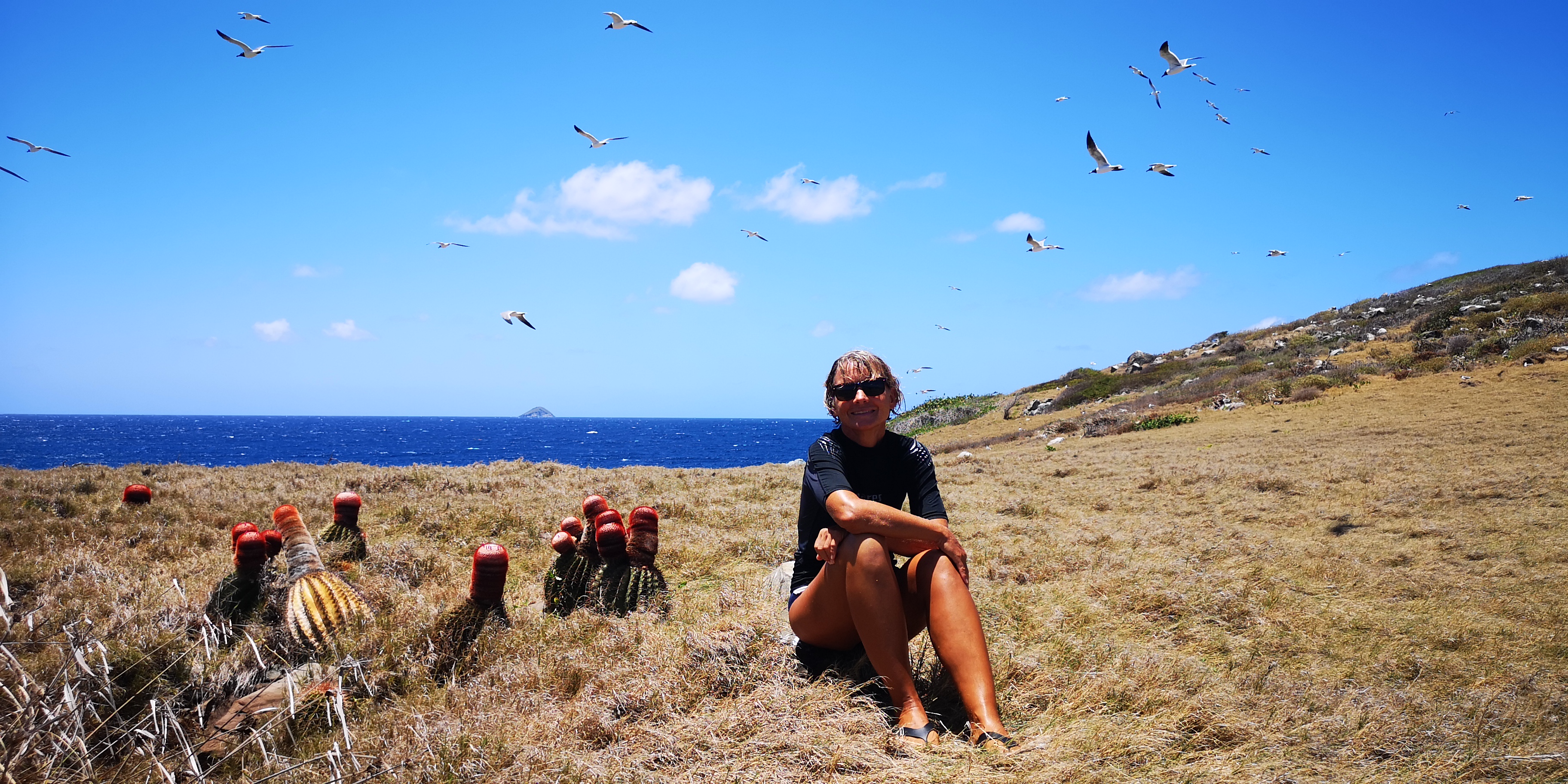 Am Strand locken alte Steinstufen. Und auf der Insel steht ein Leuchtturm, laut Törnführer dänische Architektur. Wir nehmen die Schnorchelsachen für einen Ausflug zum Strand und erkunden, ob der Zugang frei von Seeigel ist. Ist er. Von dort geht es mit den mitgebrachten Flip-Flops über die teils maroden Steinstufen und schmale Pfade hoch Richtung Leuchtturm. Umkreist werden werden wir dabei ständig von Scharen an Vögeln, zumeist Möwen. Kakteen wachsen aus trockenem Gras. Jemand hat wohl seinen Hund auf der Insel beerdigt. Samt Grabstein für den treuen Freund Rover.