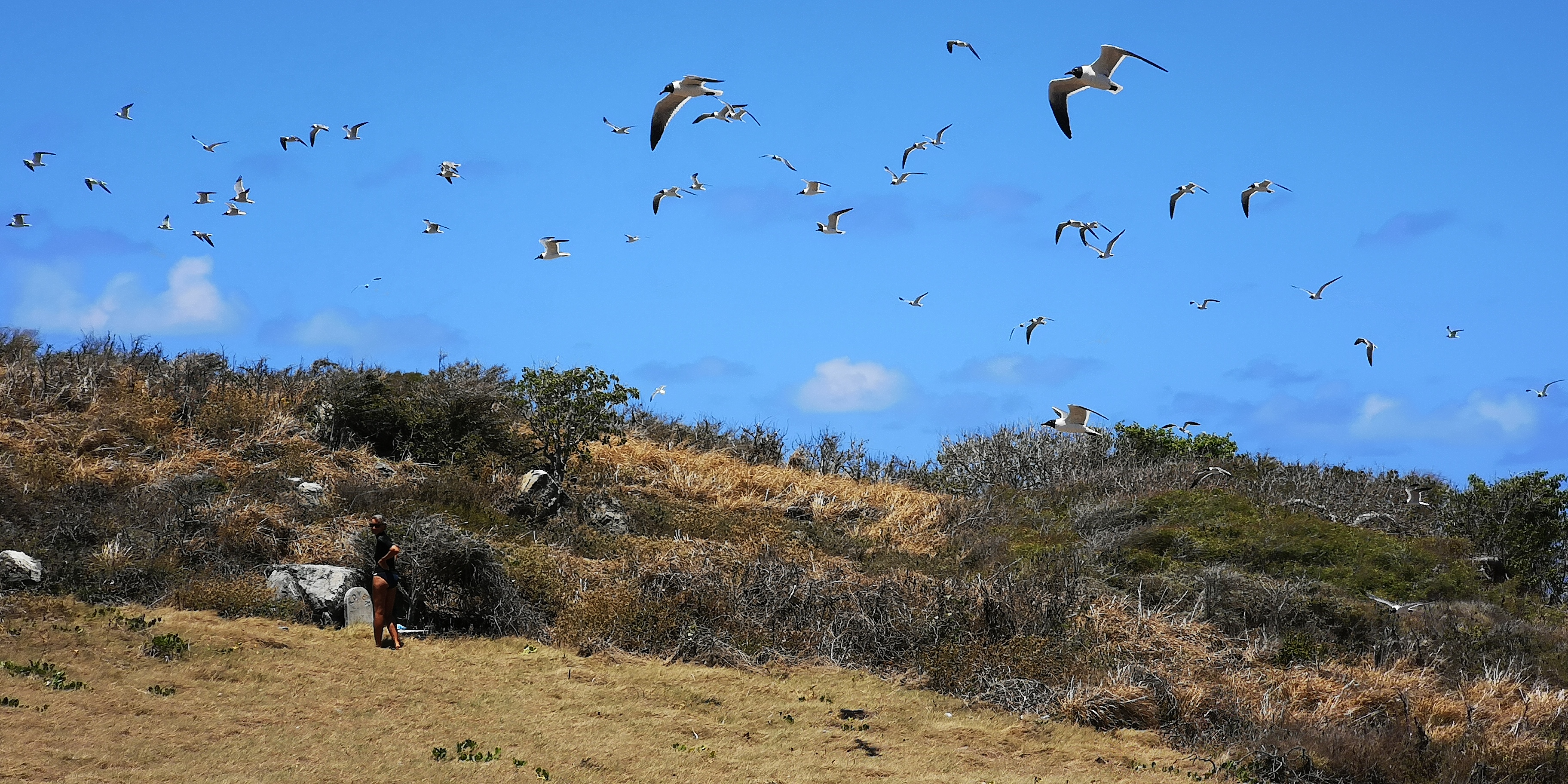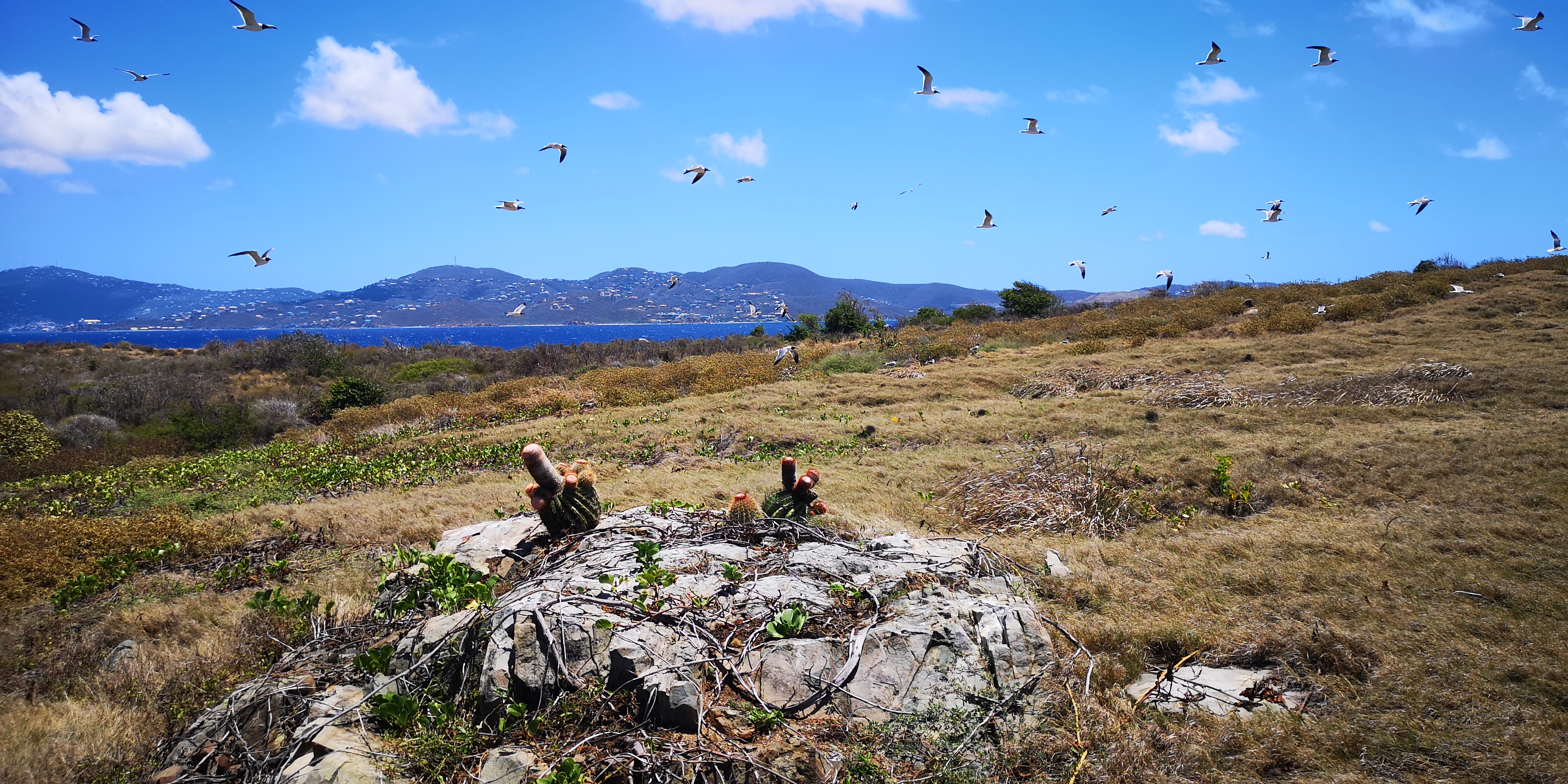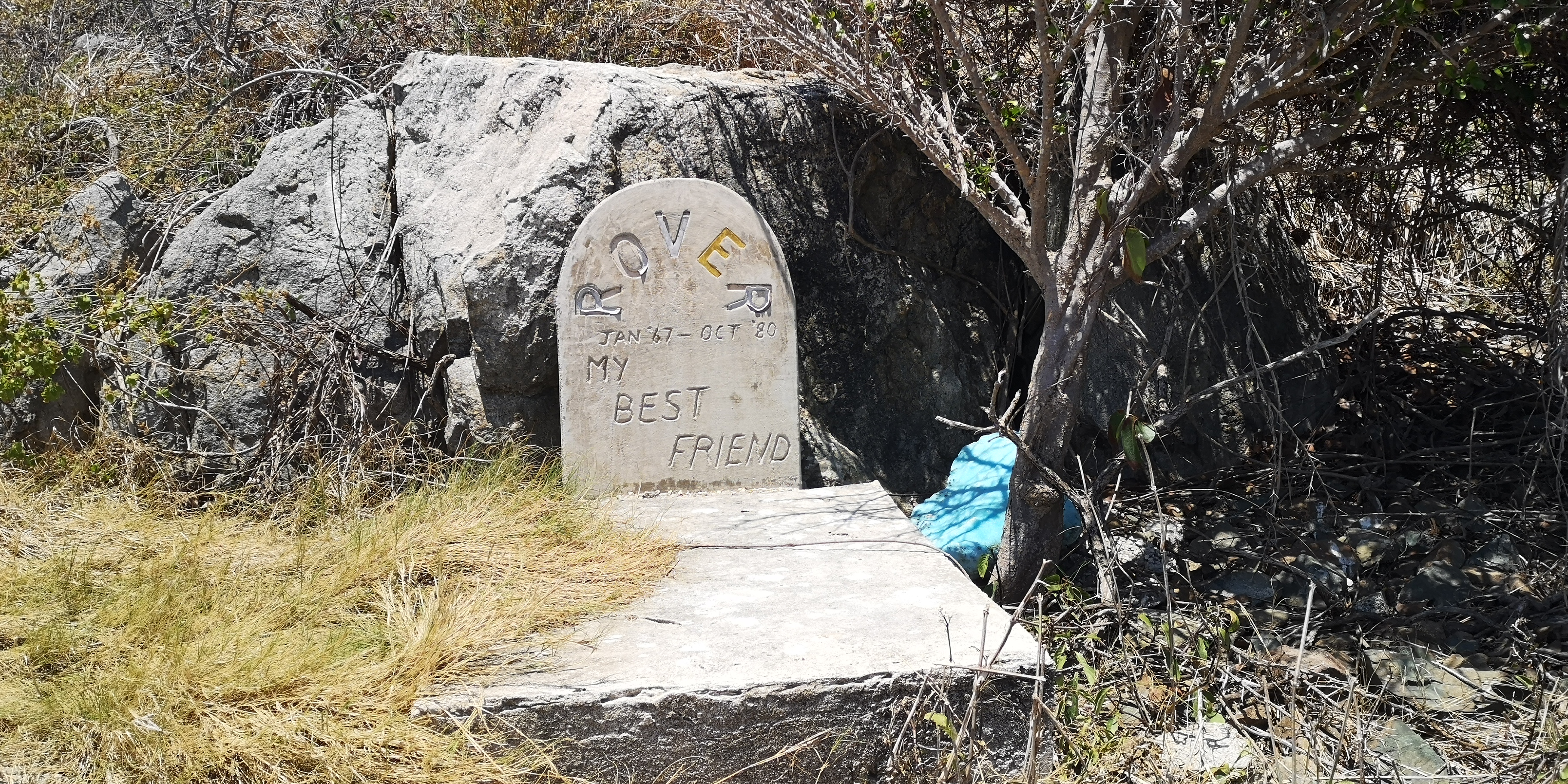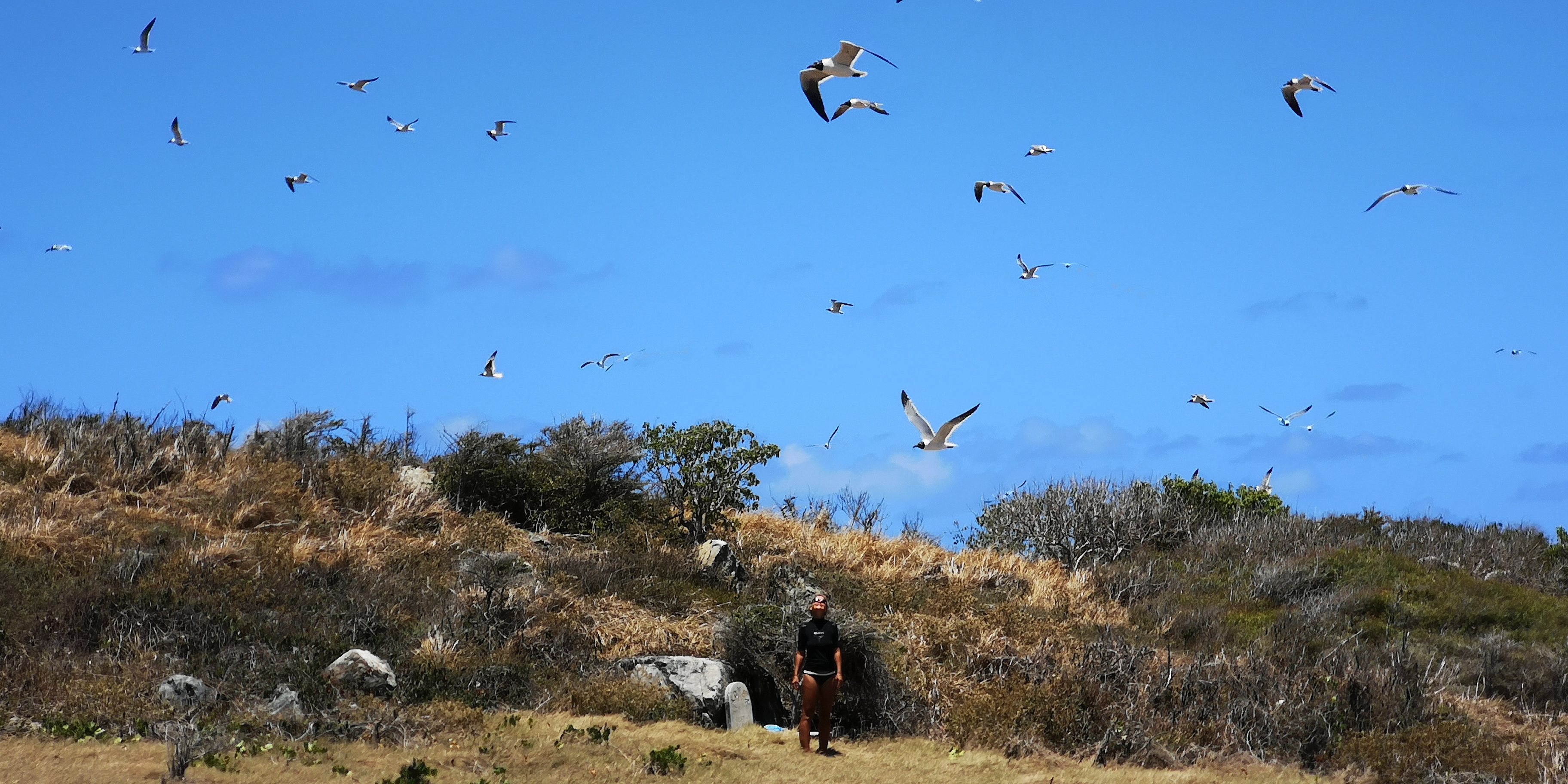 Am Strand locken alte Steinstufen. Und auf der Insel steht ein Leuchtturm, laut Törnführer dänische Architektur. Wir nehmen die Schnorchelsachen für einen Ausflug zum Strand und erkunden, ob der Zugang frei von Seeigel ist. Ist er. Von dort geht es mit den mitgebrachten Flip-Flops über die teils maroden Steinstufen und schmale Pfade hoch Richtung Leuchtturm. Umkreist werden werden wir dabei ständig von Scharen an Vögeln, zumeist Möwen. Kakteen wachsen aus trockenem Gras. Jemand hat wohl seinen Hund auf der Insel beerdigt. Samt Grabstein für den treuen Freund Rover.