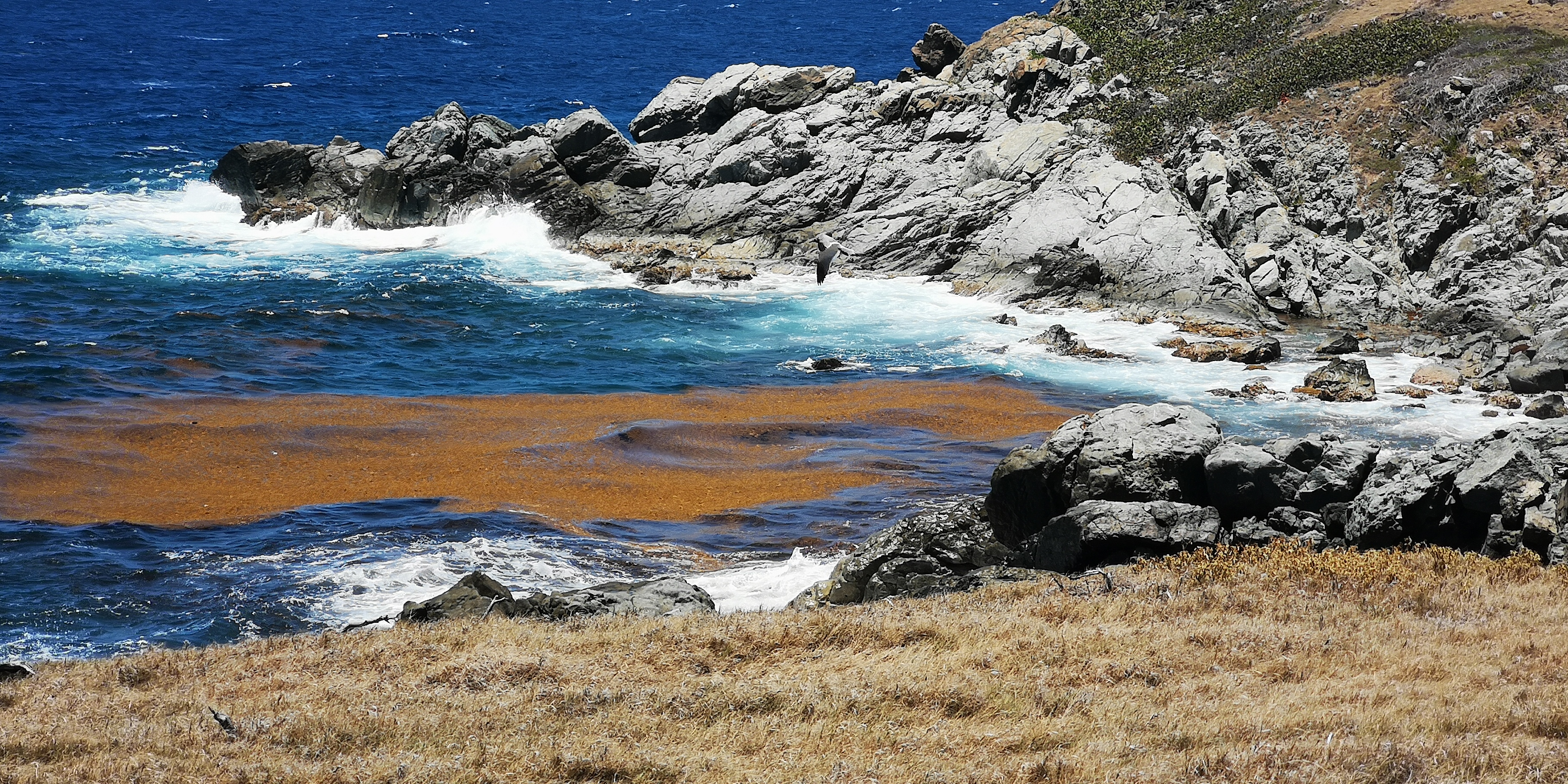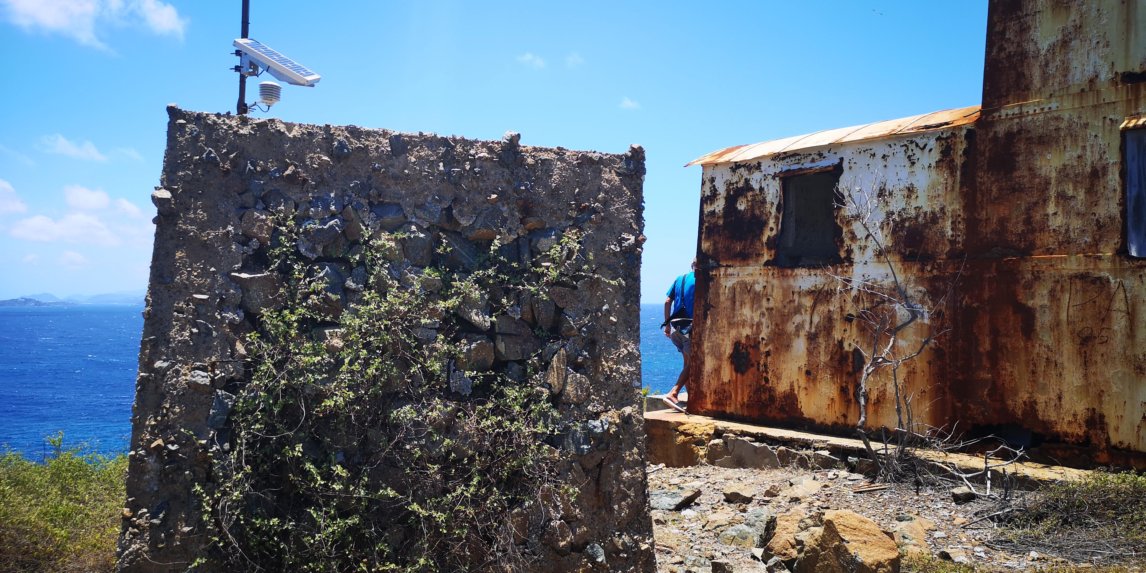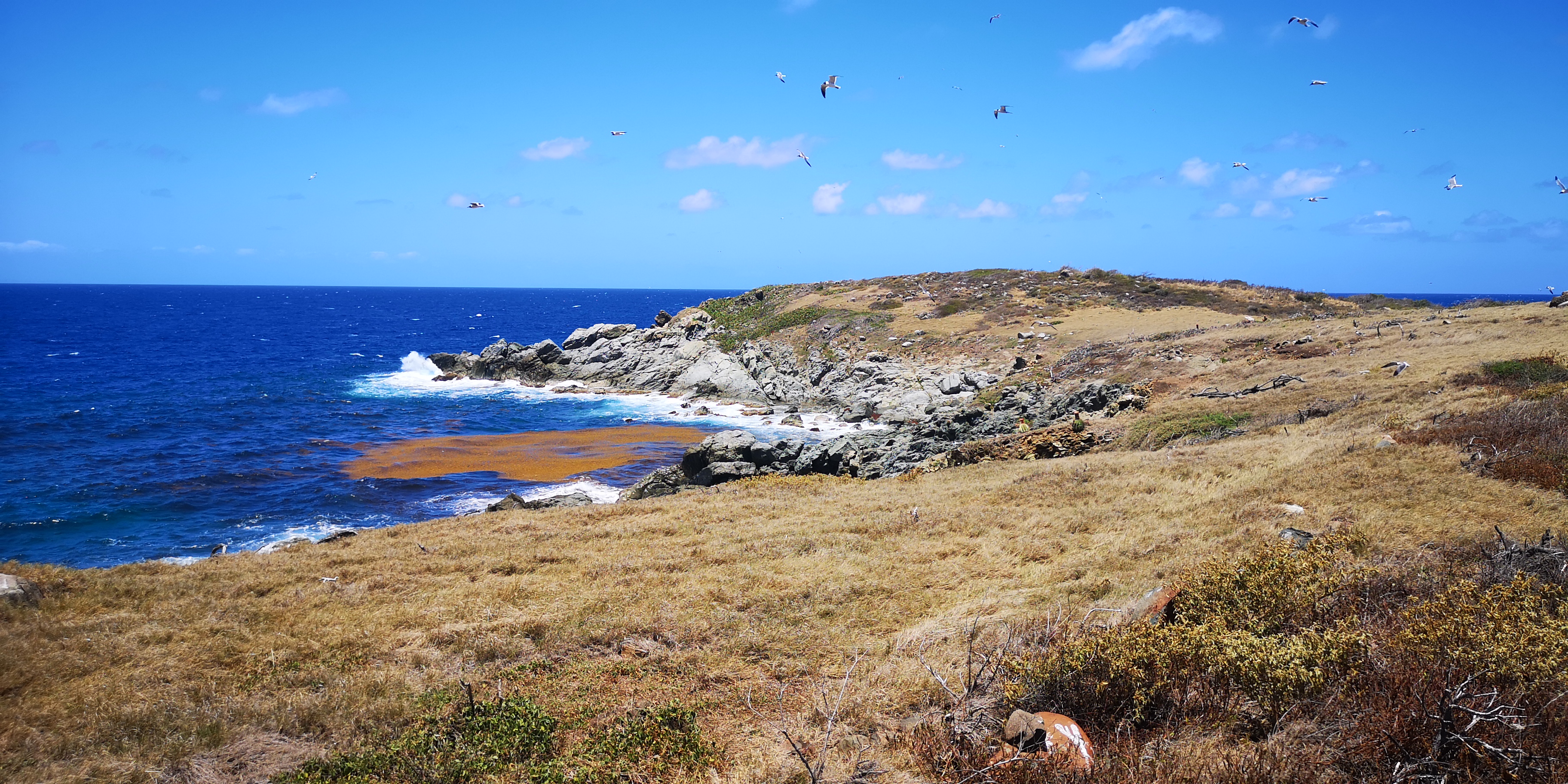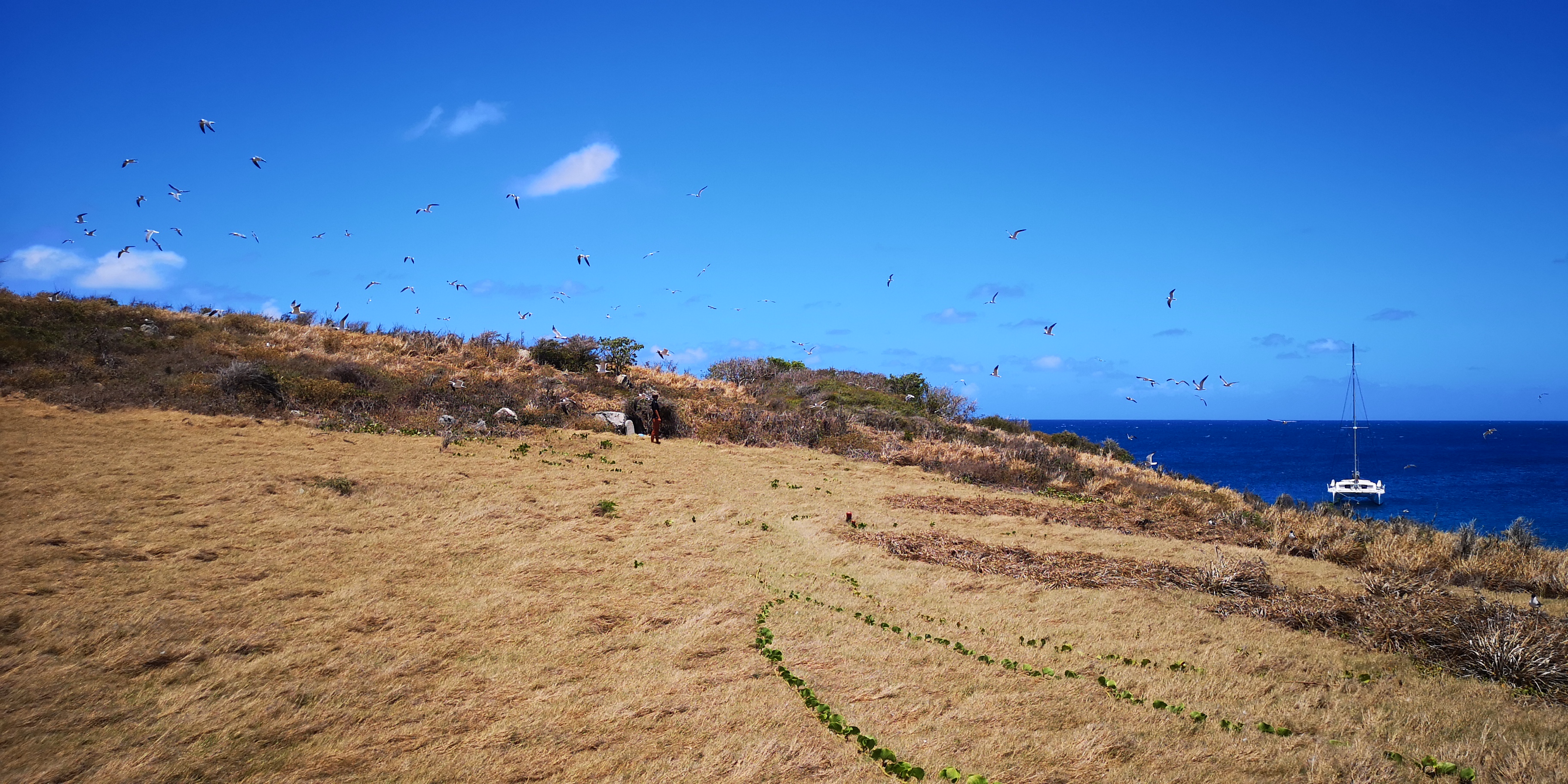 Am Strand locken alte Steinstufen. Und auf der Insel steht ein Leuchtturm, laut Törnführer dänische Architektur. Wir nehmen die Schnorchelsachen für einen Ausflug zum Strand und erkunden, ob der Zugang frei von Seeigel ist. Ist er. Von dort geht es mit den mitgebrachten Flip-Flops über die teils maroden Steinstufen und schmale Pfade hoch Richtung Leuchtturm. Umkreist werden werden wir dabei ständig von Scharen an Vögeln, zumeist Möwen. Kakteen wachsen aus trockenem Gras. Jemand hat wohl seinen Hund auf der Insel beerdigt. Samt Grabstein für den treuen Freund Rover.