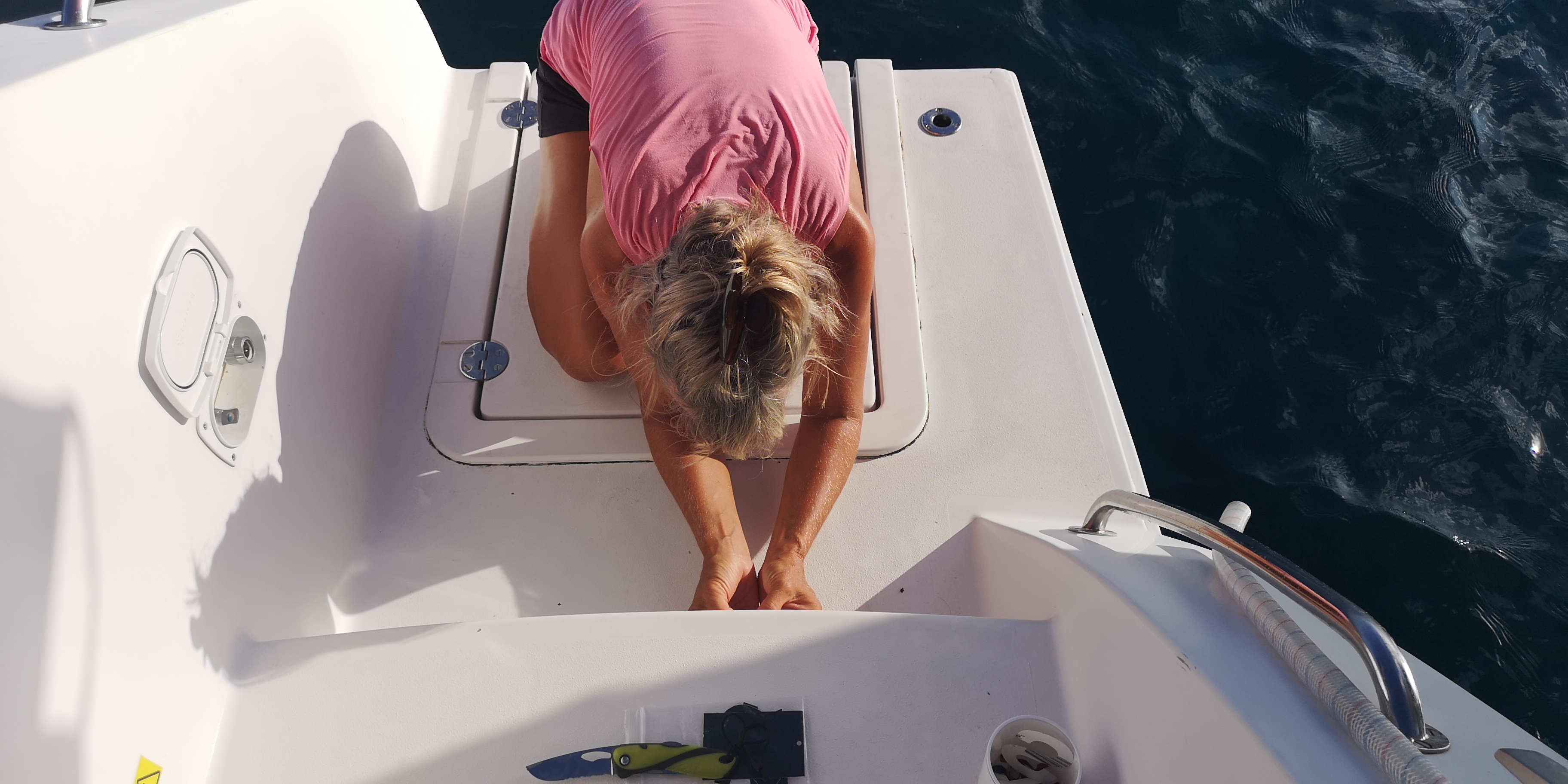 Wir nehmen eine dunkelrote Boje in der Mitte der Bucht. Ich tauche sie mit der Schnorchelausrüstung ab – sieht gut aus.
