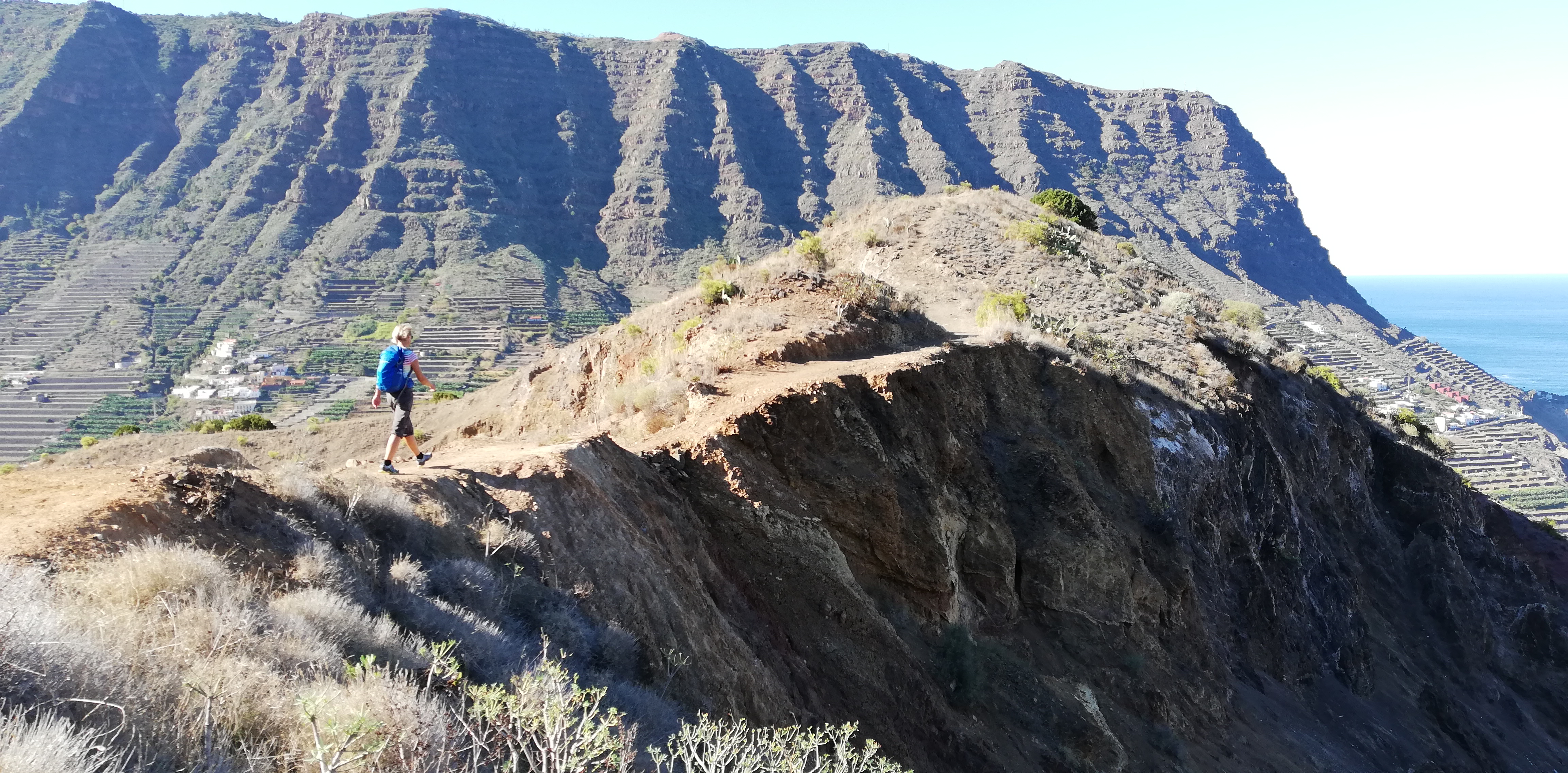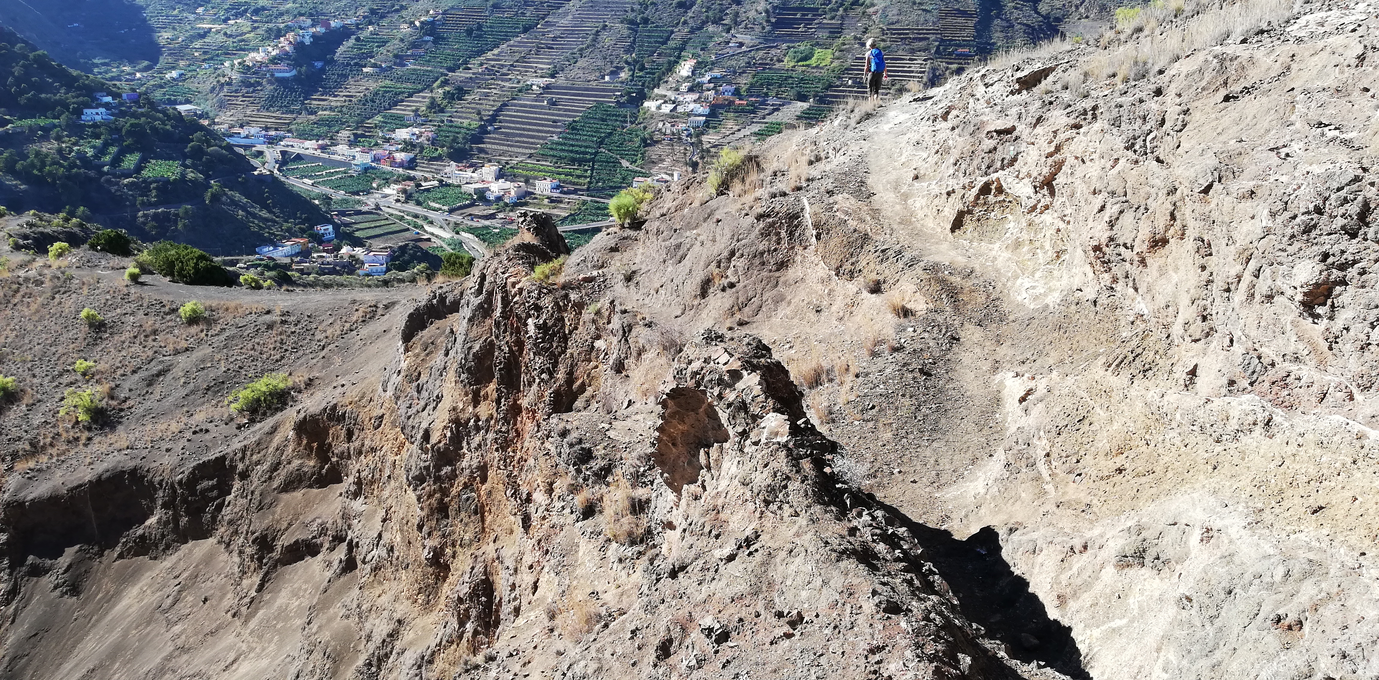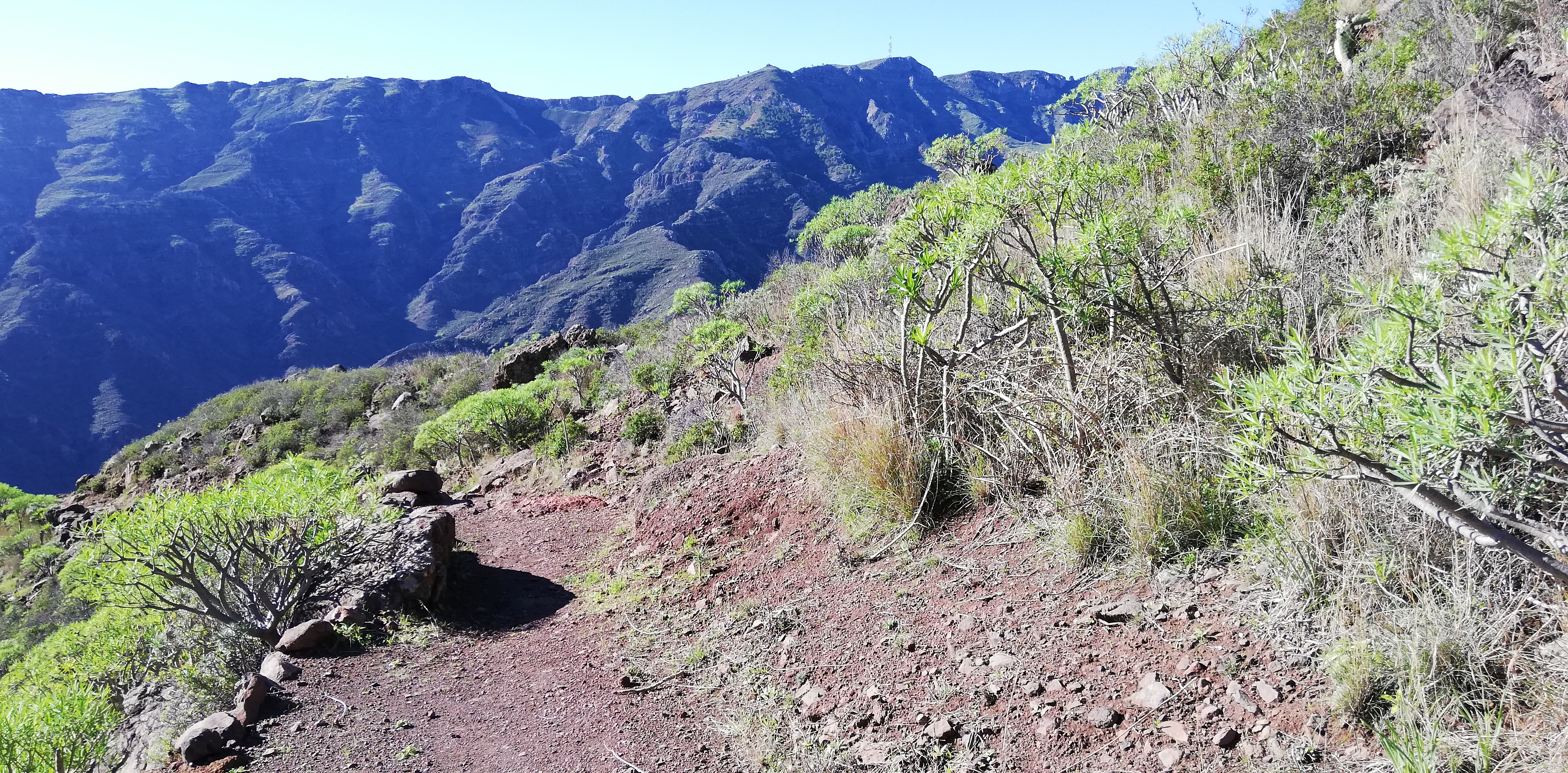 Die letzten Kilometer werden dann aber doch mühsam. Der mitgenommene Wasservorrat ist längst aufgebraucht, denn der Weg war wegen der „Abkürzung“ durch den Barranco viel anstrengender als vermutet. Und sicher deutlich länger als ausgeschildert. Schon auf La Palma fiel uns auf, dass man sich auf die Angaben nicht wirklich verlassen kann: Manchmal bedeutet die Angabe von z.B. „2km“: Es ist gleich um die Ecke, ein anderes Mal: „Noch 5 oder 6km“ – weil man als Fussgänger halt mit der Luftlinie nicht viel anfangen kann.