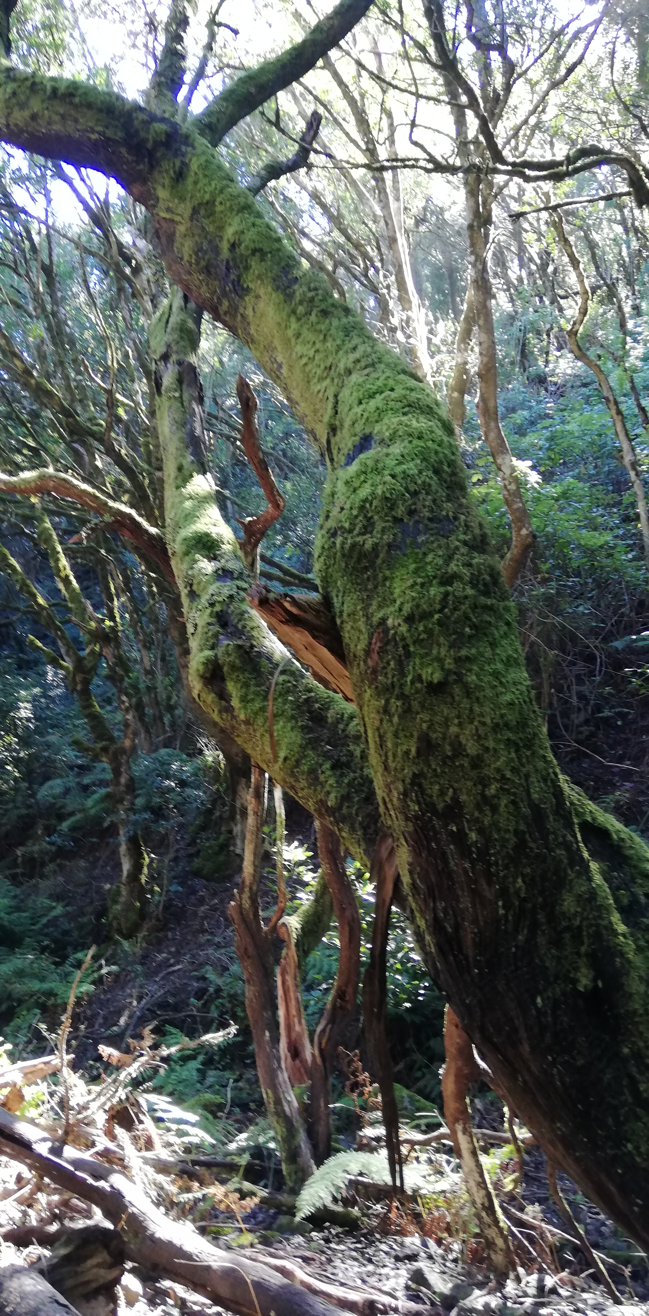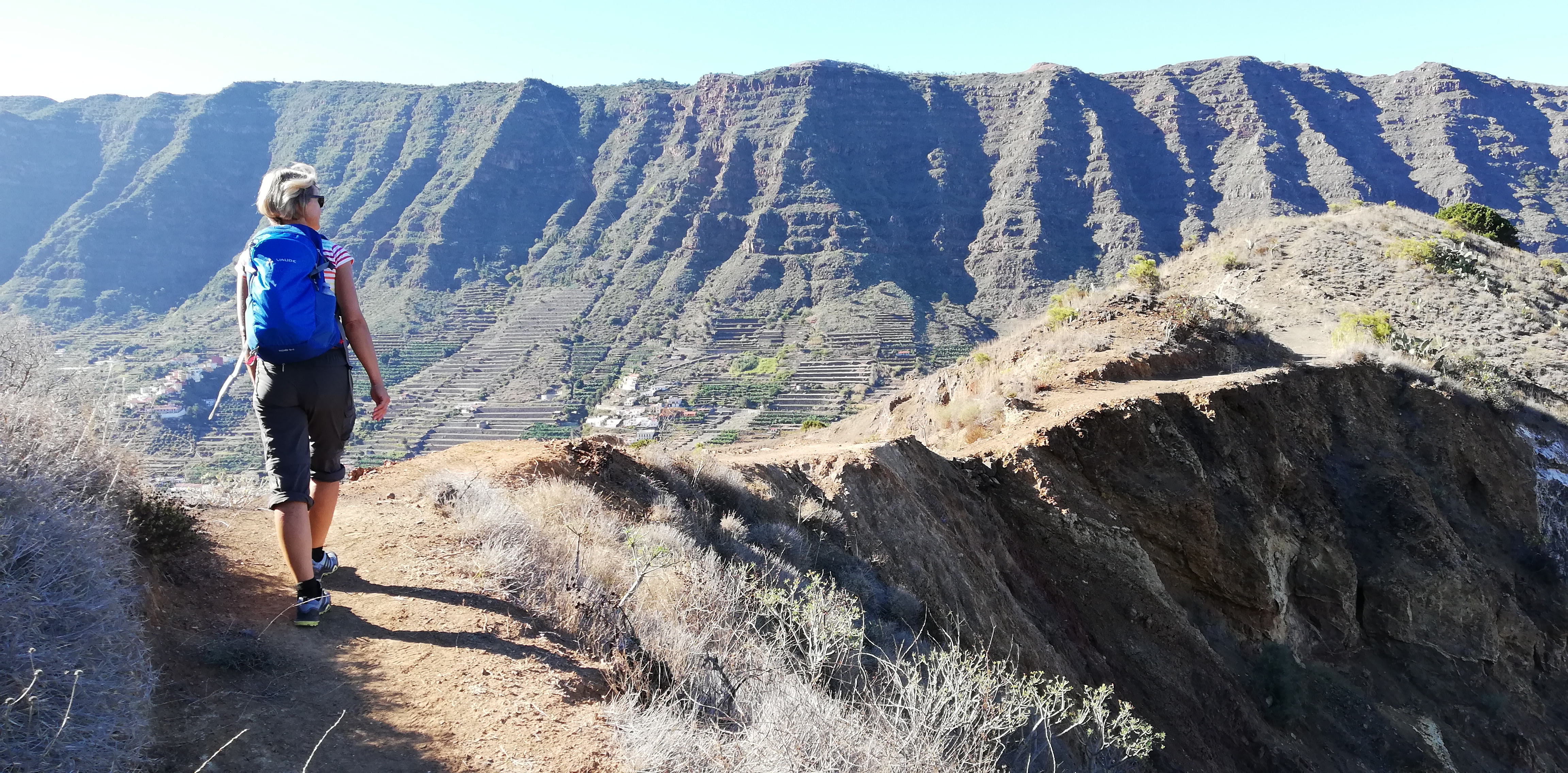 Der führt durch den Barranco de Las Casas, einer Schlucht, hoch zum Gipfel. Und entpuppt sich als wunderschöner, aber recht anstrengender Pfad mit einigen Klettereinlagen. Die capitania, gebürtige Nordrhein-Westfälische Flachlandtirolerin, ist dank jahrzehntelangem Aufenthalt im bayrischen und schweizerischen Gebirgsland aber gestählt und meistert die anspruchsvolle Herausforderung mit links. (Bis auf das Hängenbleiben an einer der zahlreichen Brombeerranken, an denen wir uns auf dem schmalen Pfad vorbei-und untendurch fädeln müssen. Fies wenn so eine an den nackten Beinen hängen bleibt. Aber den Hindernislauf durch Ranken hatten wir wohl bisher nicht ausreichend trainiert).