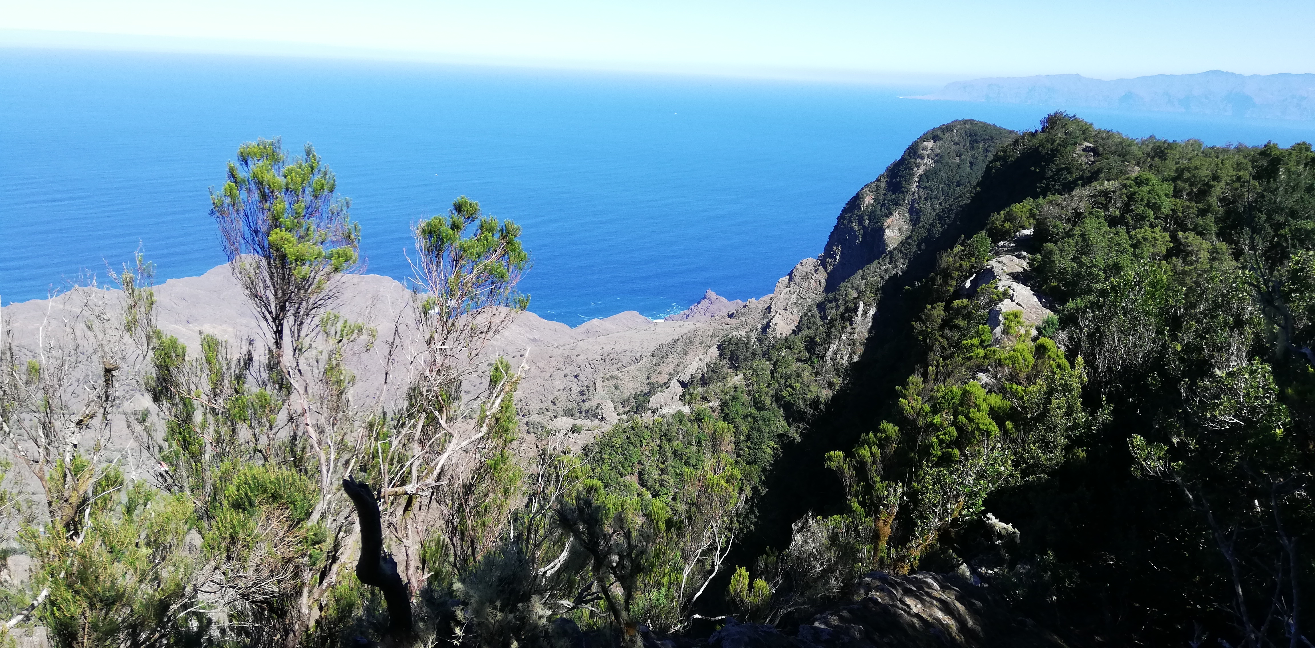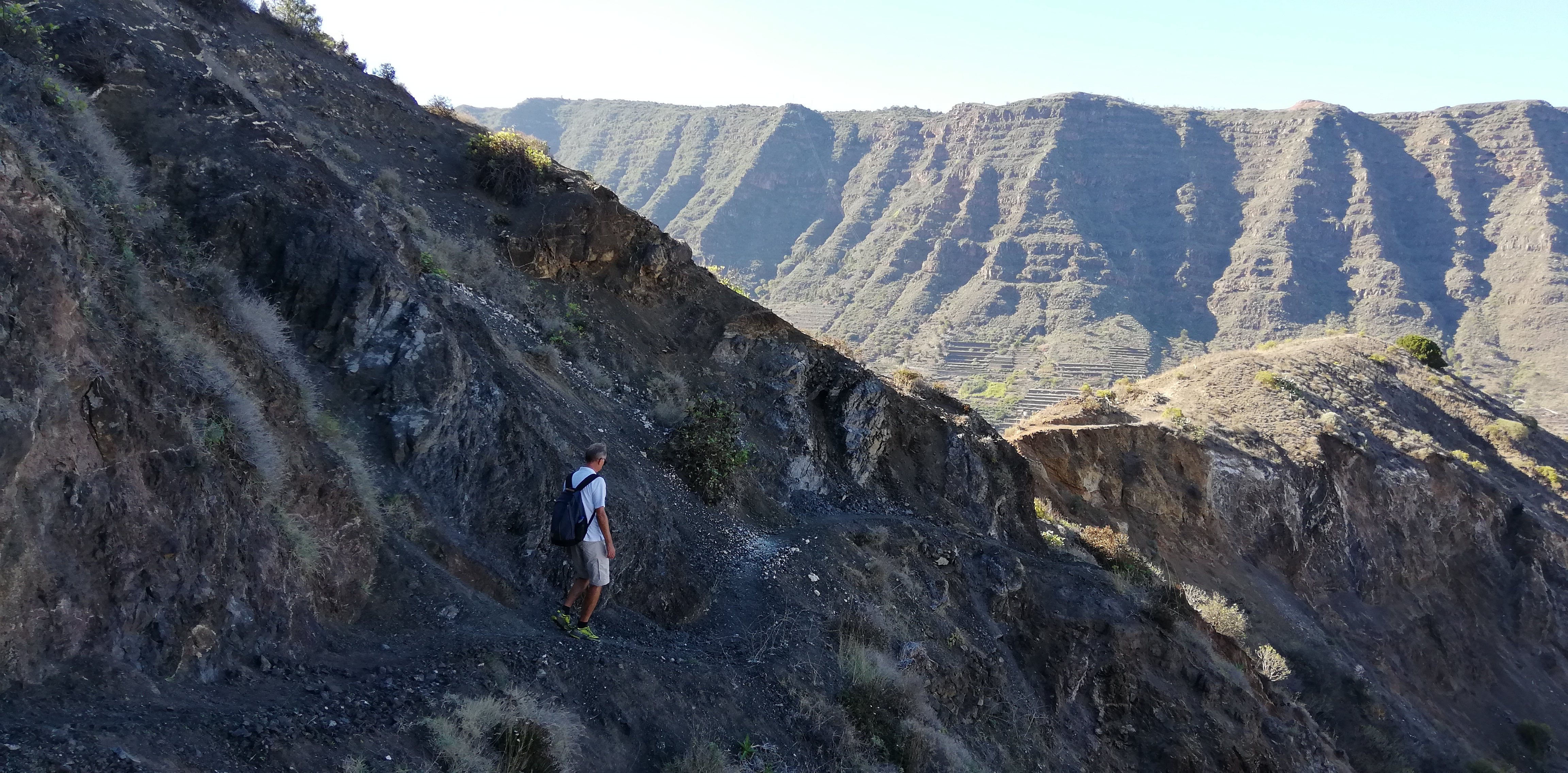 Der captain sehnt sich zusehends nach einem kühlen Bier und wird langsam ungeduldig. Dummerweise endet genau dann, als das Ziel Hermigua in Sicht kommt und die ersten Hütten erreicht sind, die Beschilderung des Wegs. Um Hermigua zu erreichen müssen wir noch über eine kleine Schlucht – und den Weg zu finden ist mühsamer als es den Anschein hat.