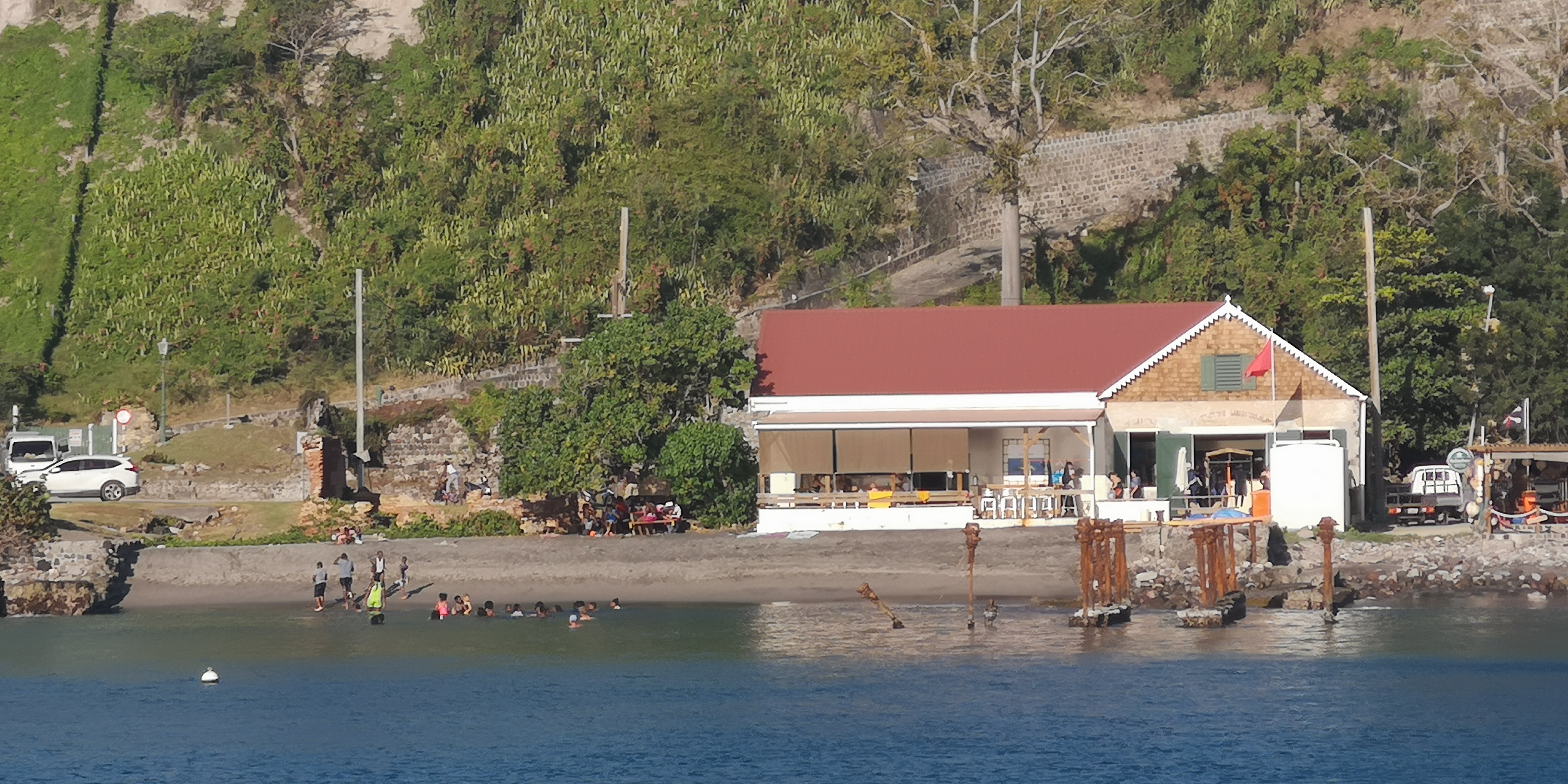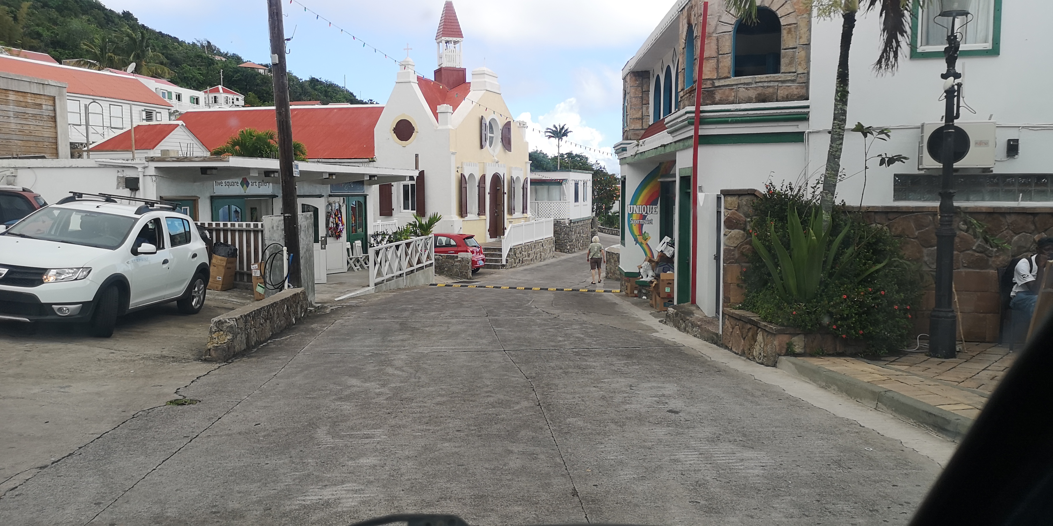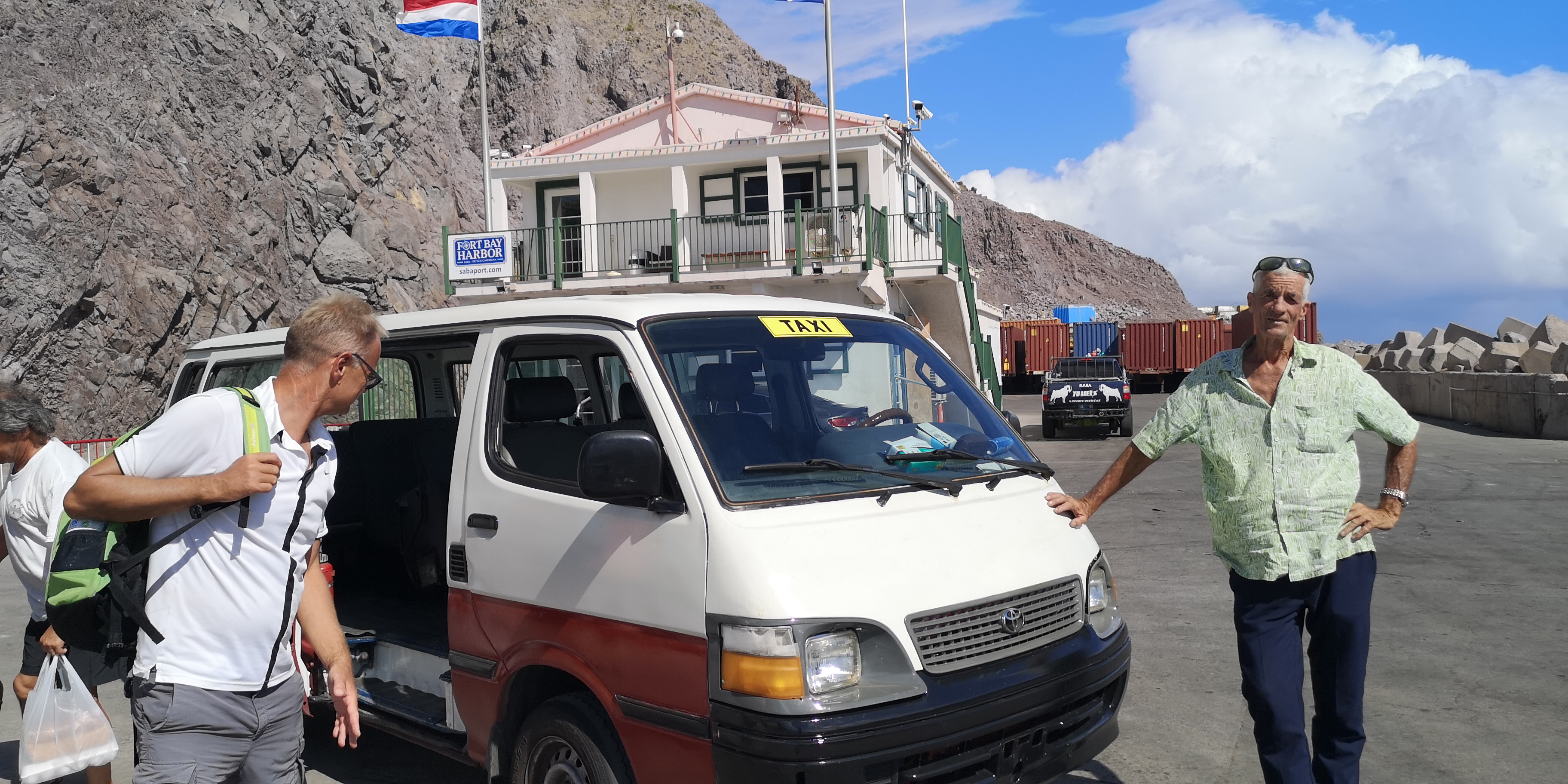 Ich frage den Fahrer eines gelben Minibusses, der gerade im Hafen hält und eine Reihe Kinder aussteigen lässt. Er ist bereit, uns 6 Segler mit in den Ort hoch zu nehmen. Erst beim Einsteigen stelle ich fest, dass ich den Schulbusfahrer angequatscht hatte. Er hatte gerade Schulkinder zum Schnorcheln runter gefahren. Typisch für die sehr netten Leute auf Saba: Er nimmt uns nicht nur mit rauf, sondern hält später auf der Abwärtsfahrt sofort, als er uns runter zurück zum Hafen laufen sieht. Einmal Schulbus und zurück.