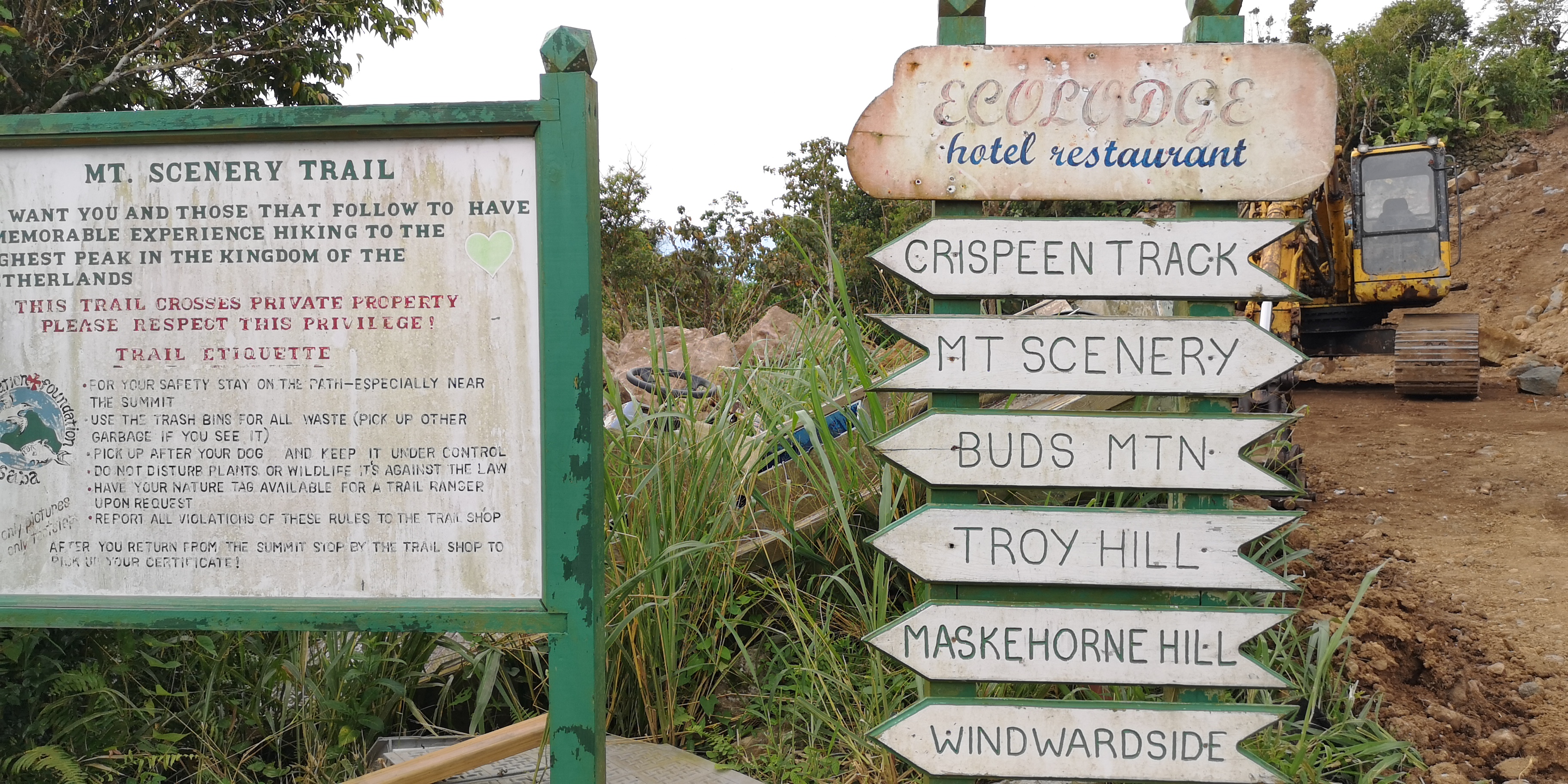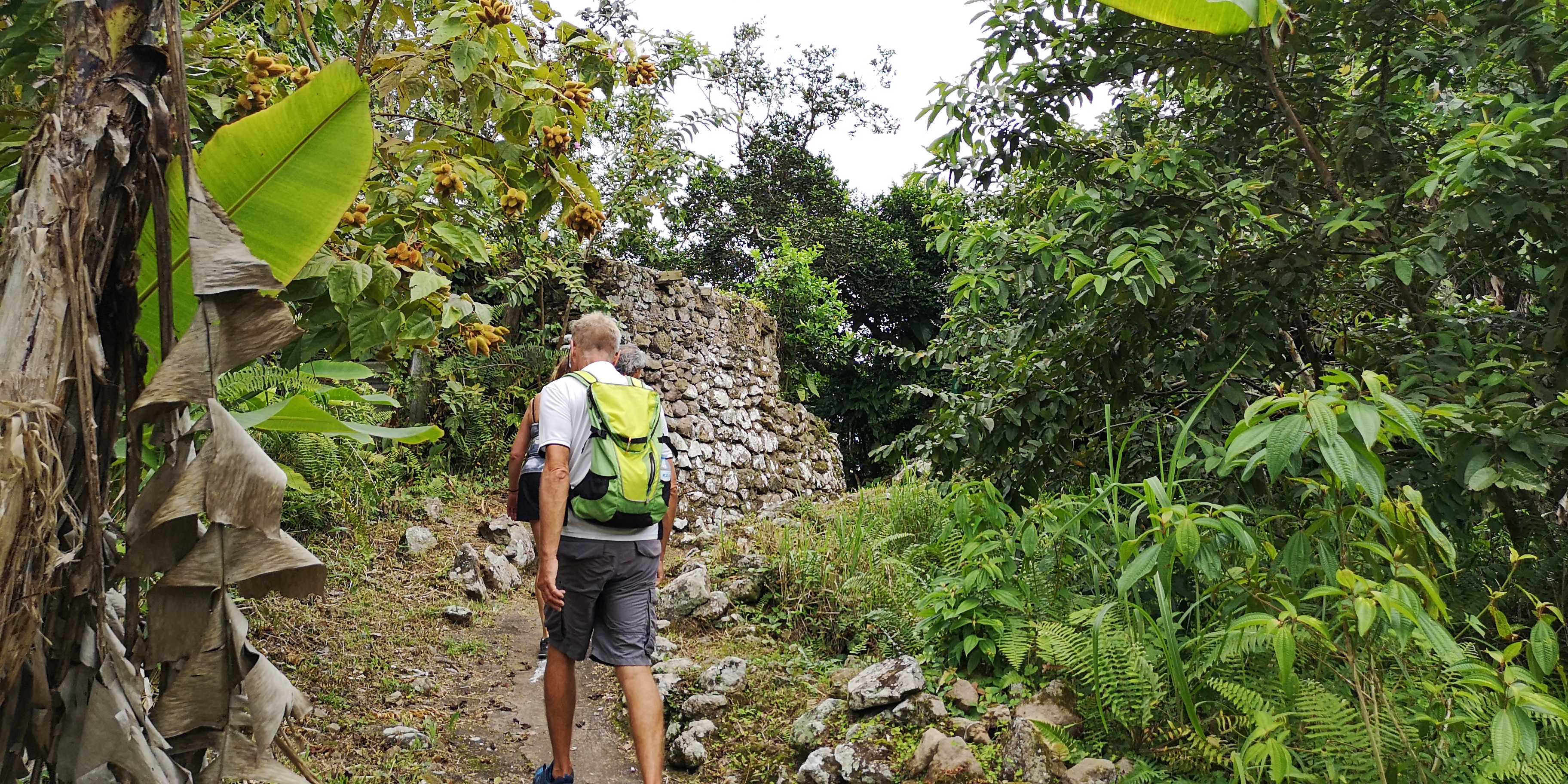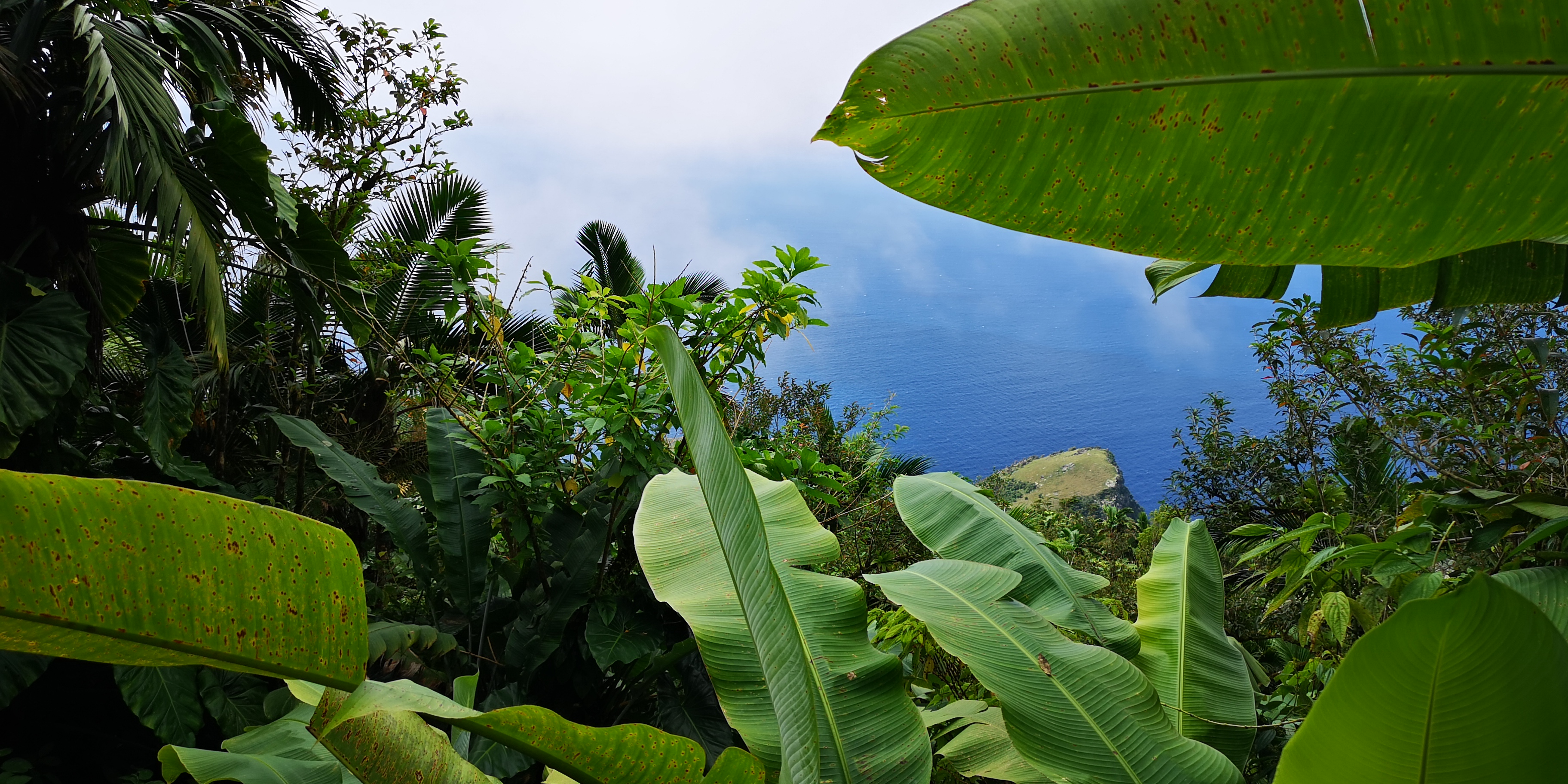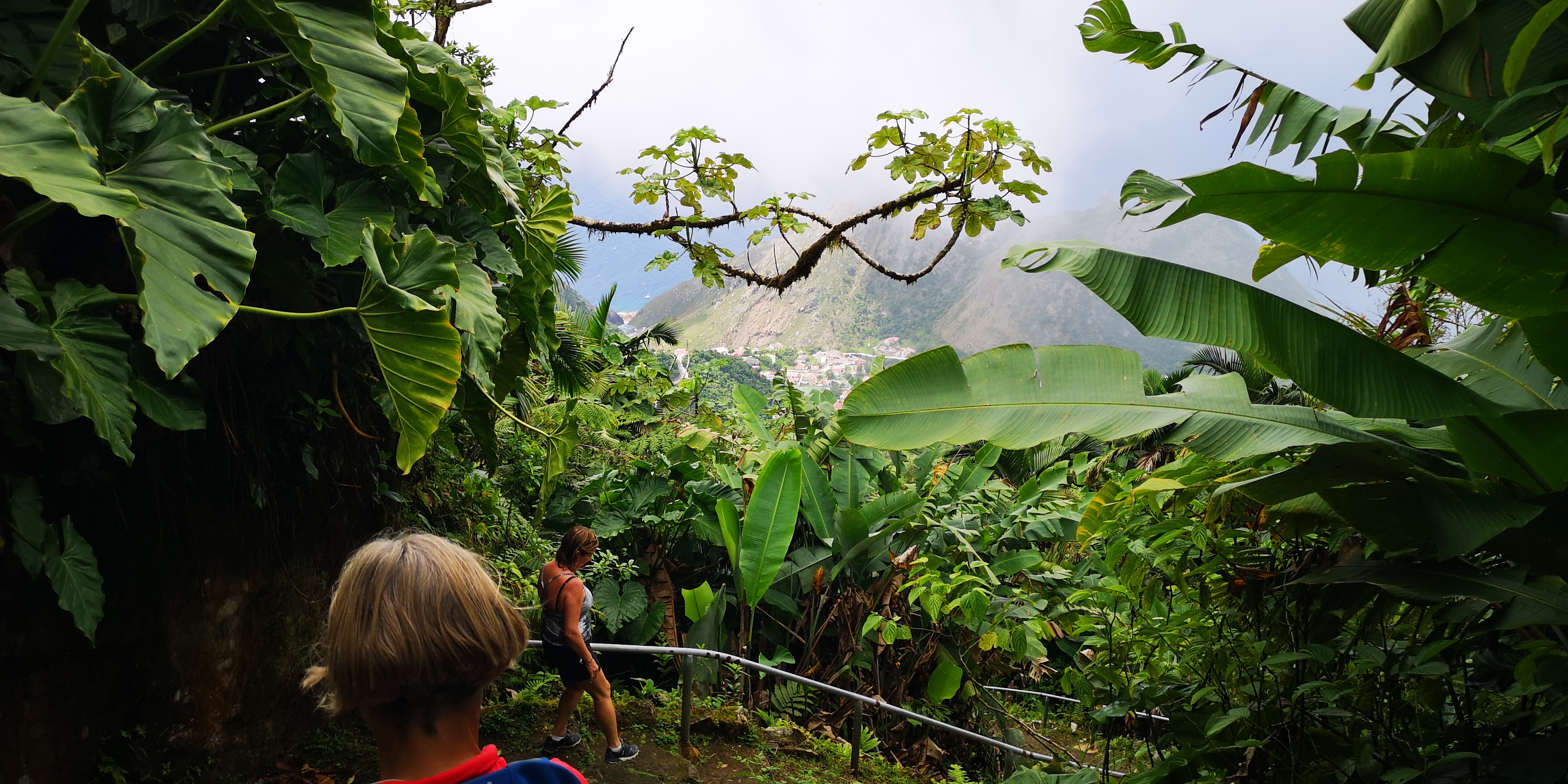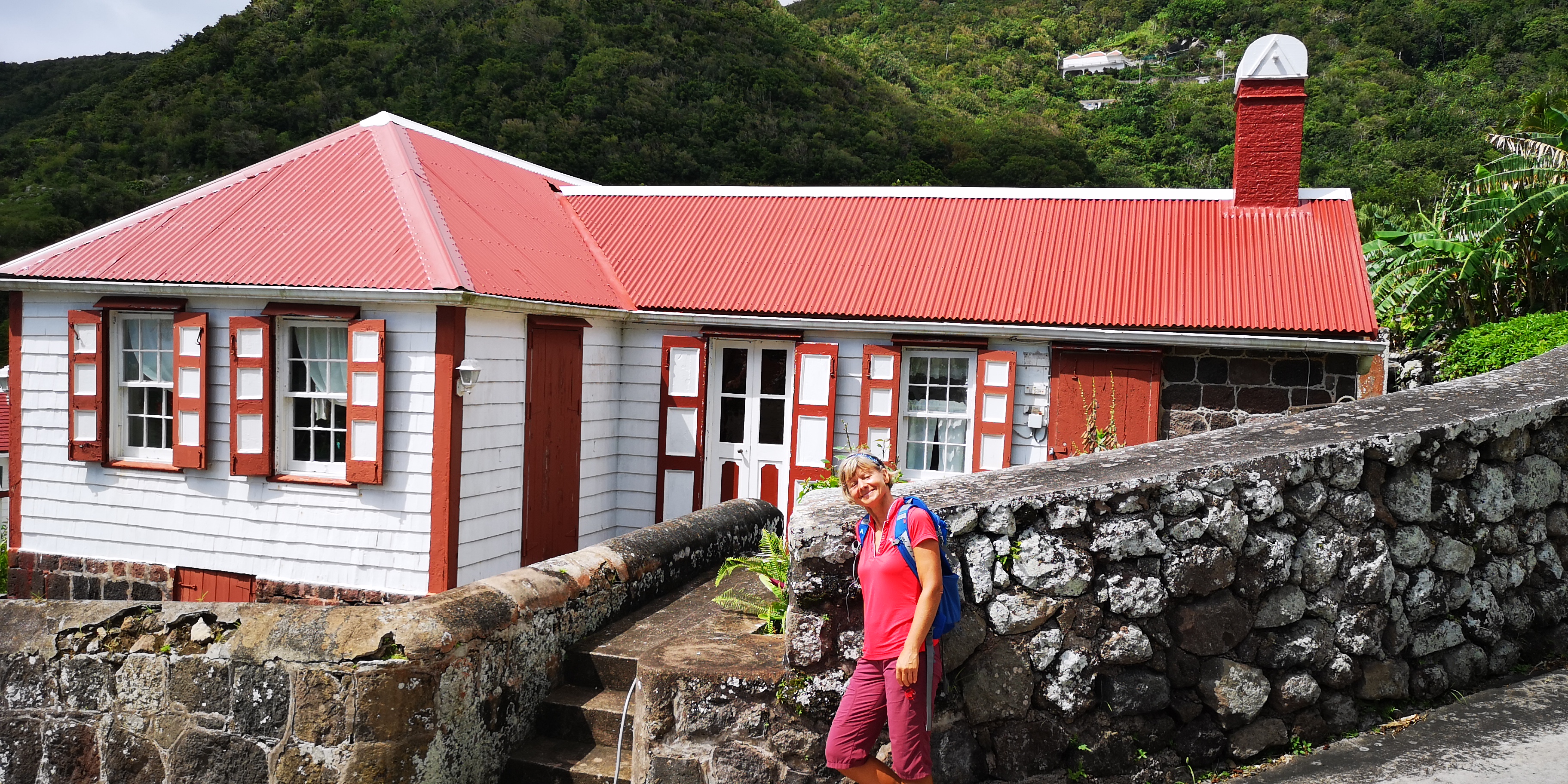 Wir verabreden mit 2 kanadischen Paaren, die ebenfalls auf die Behörden warten, gemeinsam ein Taxi zum nächsten Ort Bottom zu nehmen. Ein lustiger Name für einen Ort, der wie alle anderen auf Saba weit oben liegt. Der Ursprung des Namens liegt im holländischen und stammt ab vom Wort für „Schüssel“ entsprechend der Geländeform um den Ort. Die untere Hälfte der Insel ist unbesiedelt, weil karger Fels. Nur der kleine Hafen und ein Marmorsteinbruch liegen dort. Die wenigen Orte und einzelne Häuser liegen oben in den Hängen. Denn diese halten die Regenwolken und sorgen für fruchtbares Grün über der kargen unteren Inselhälfte.