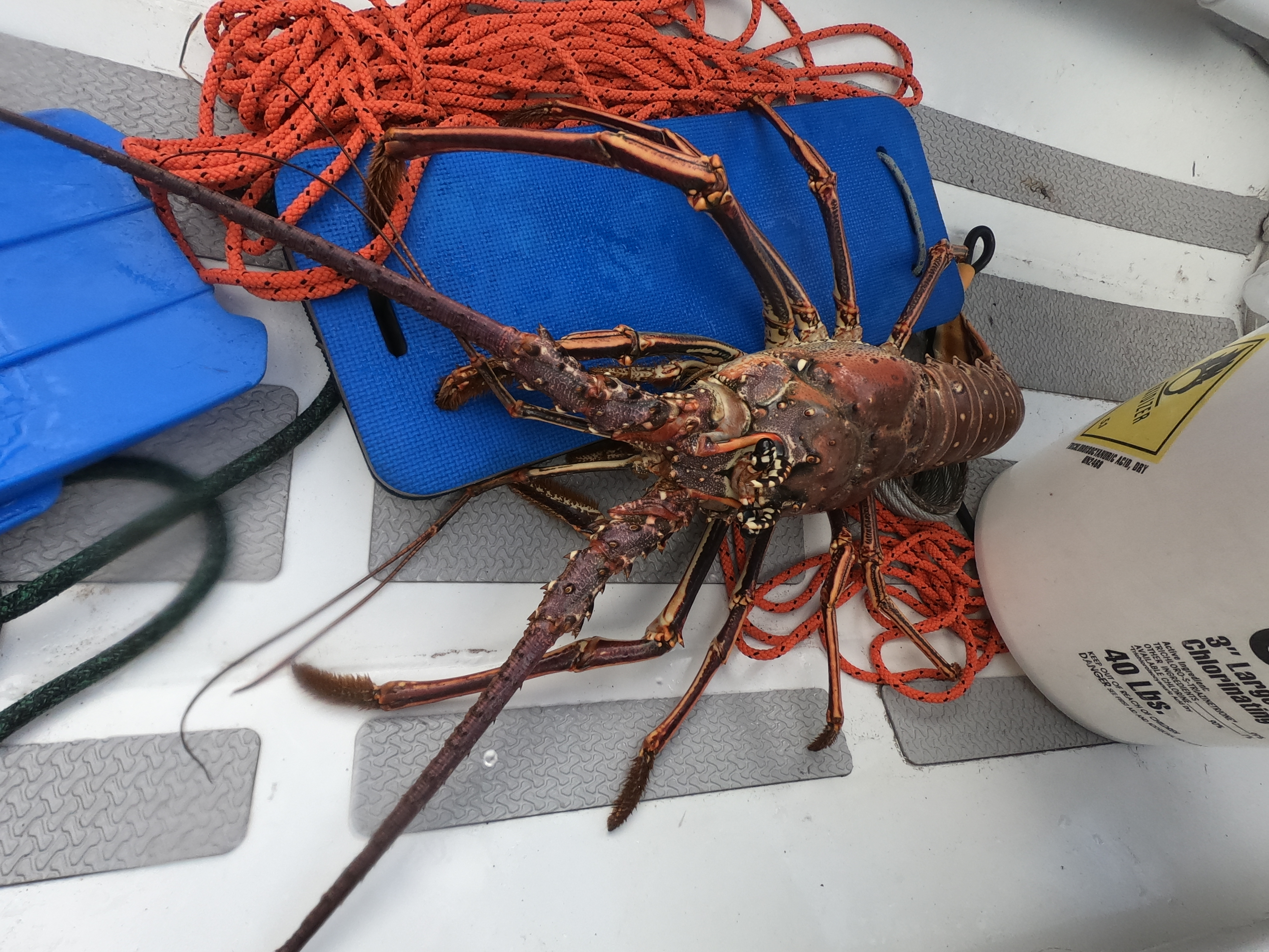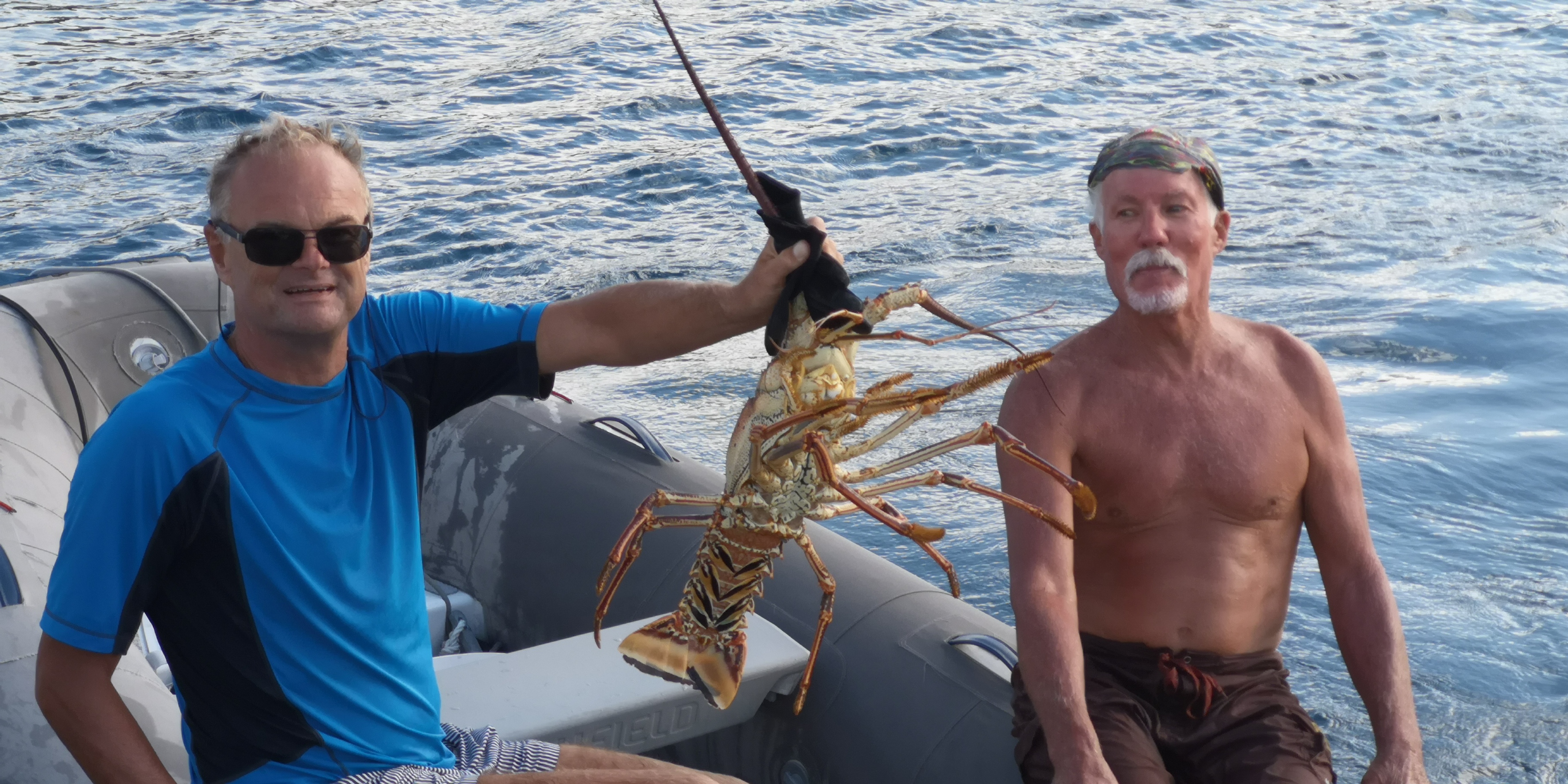 Mit Clark von der Queen of Hearts geht’s einmal um die Ecke an die Felsen zum Lobster-Fangen. Nach 5 Minuten haben wir den 1. Weitere 5 Minuten später einen zweiten, der sich aber als trächtiges Weibchen entpuppt. Wir lassen sie unversehrt wieder frei und sie verschwindet sofort in ihrem Unterschlupf. Wir brauchen dann doch noch weitere 10 Minuten um einen 3ten zu erwischen. Wir sehen gleich noch 2 weitere, doch die lassen wir für später. Die beiden, die wir gefangen haben, reichen für ein ordentliches Abendessen. Und für einen riesengroßen Lobster-Salat am Tag drauf, denn die Mädels verzichten beide wegen Allergie auf den Lobster. Zudem sollte ich wegen meiner Gicht (Schalentiere haben sehr viel Purin) ohnehin aufpassen – aber Ausnahmen sind immer drin.