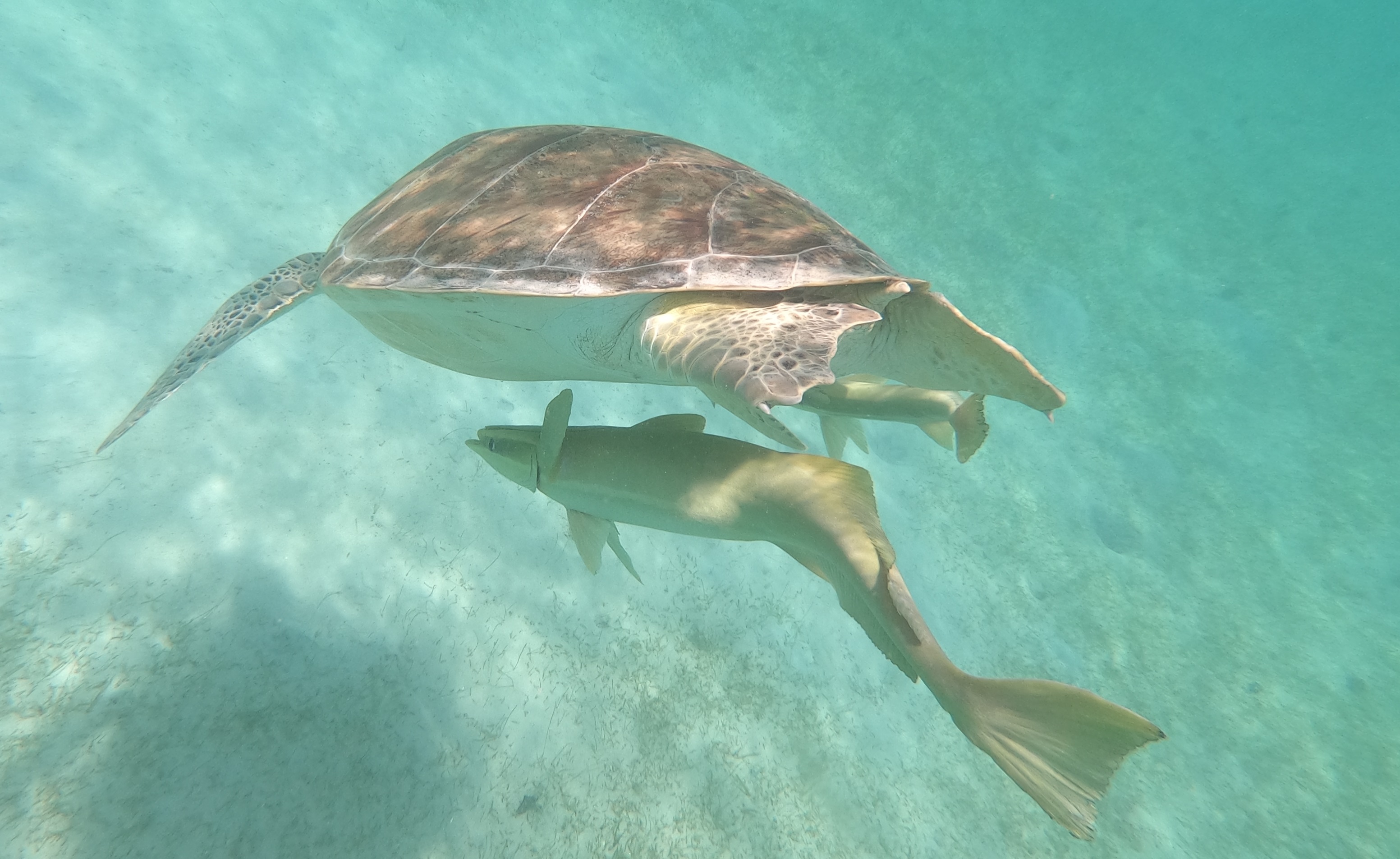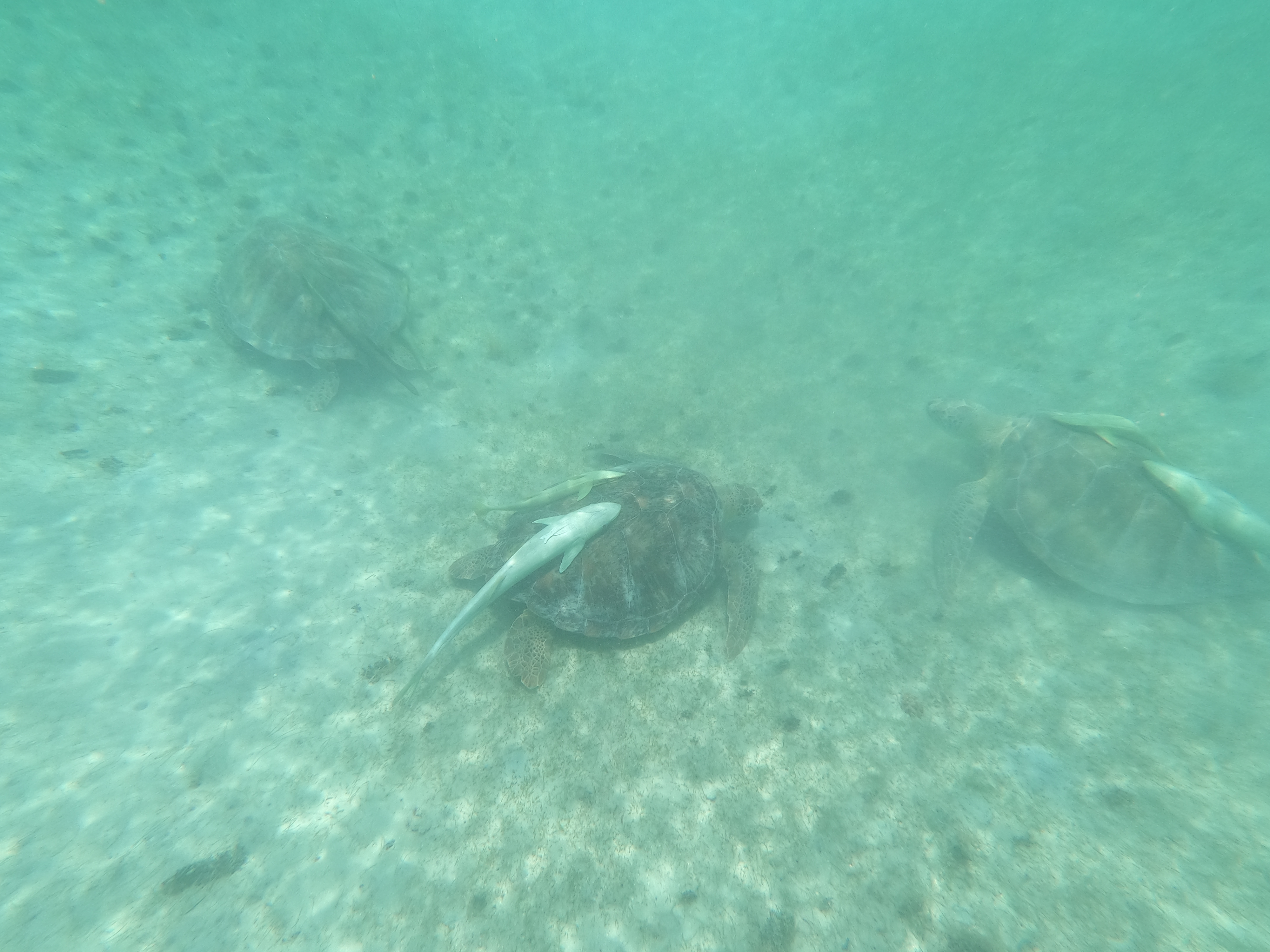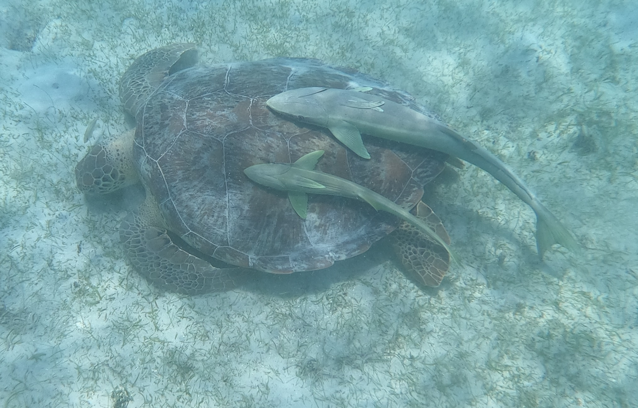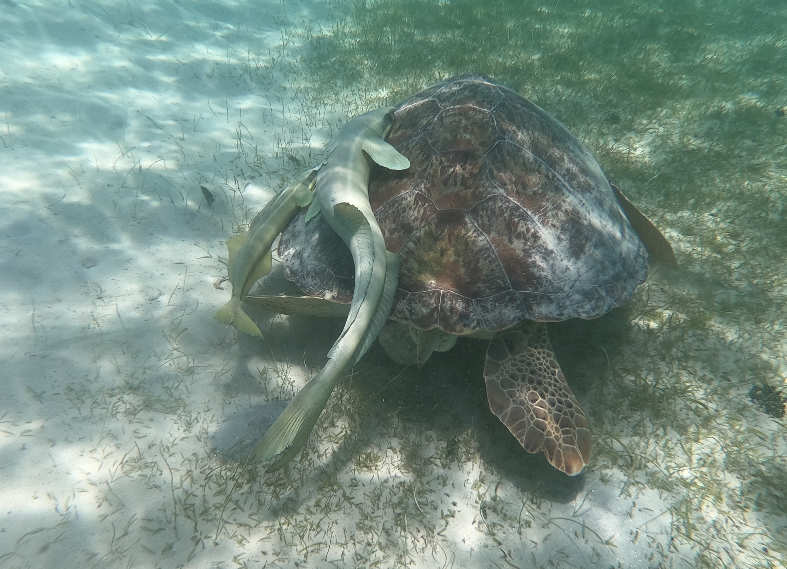 An den Schildkröten haben sich Schiffshalter festgesaugt. Diese Fische sind auch sehr gerne am Rumpf der INVIA – entsprechende Bilder hatte ich schonmal im BLOG gepostet. Mit ihrer großen Saugplatte saugen sie sich fest: Am Unterwasserschiff eines Segelbootes, an Walfischen, manchen Haien oder eben an Schildkröten. Im Video oben ist gut zu sehen wie sich der Fisch dazu auf den Rücken dreht und fest saugt.