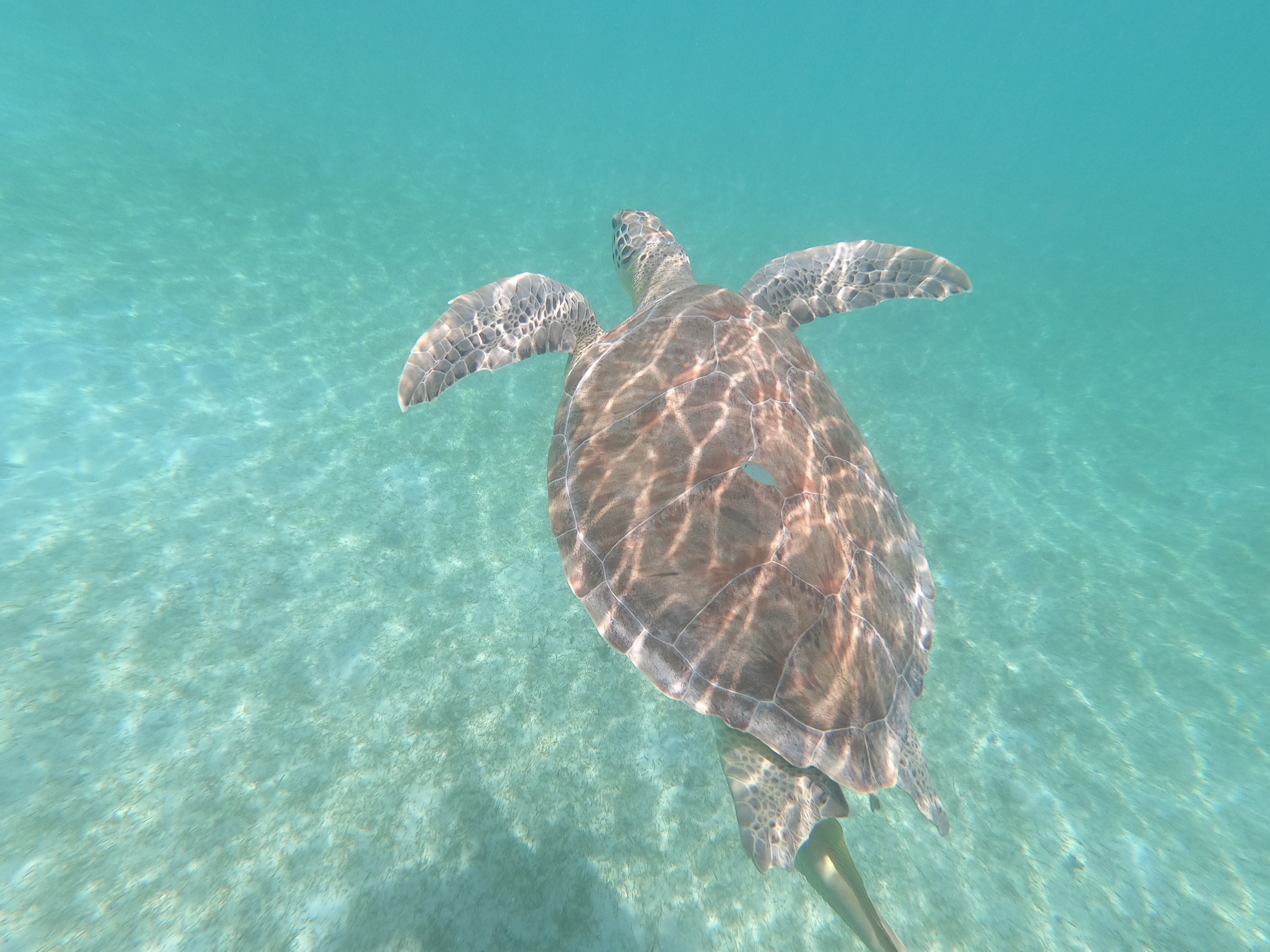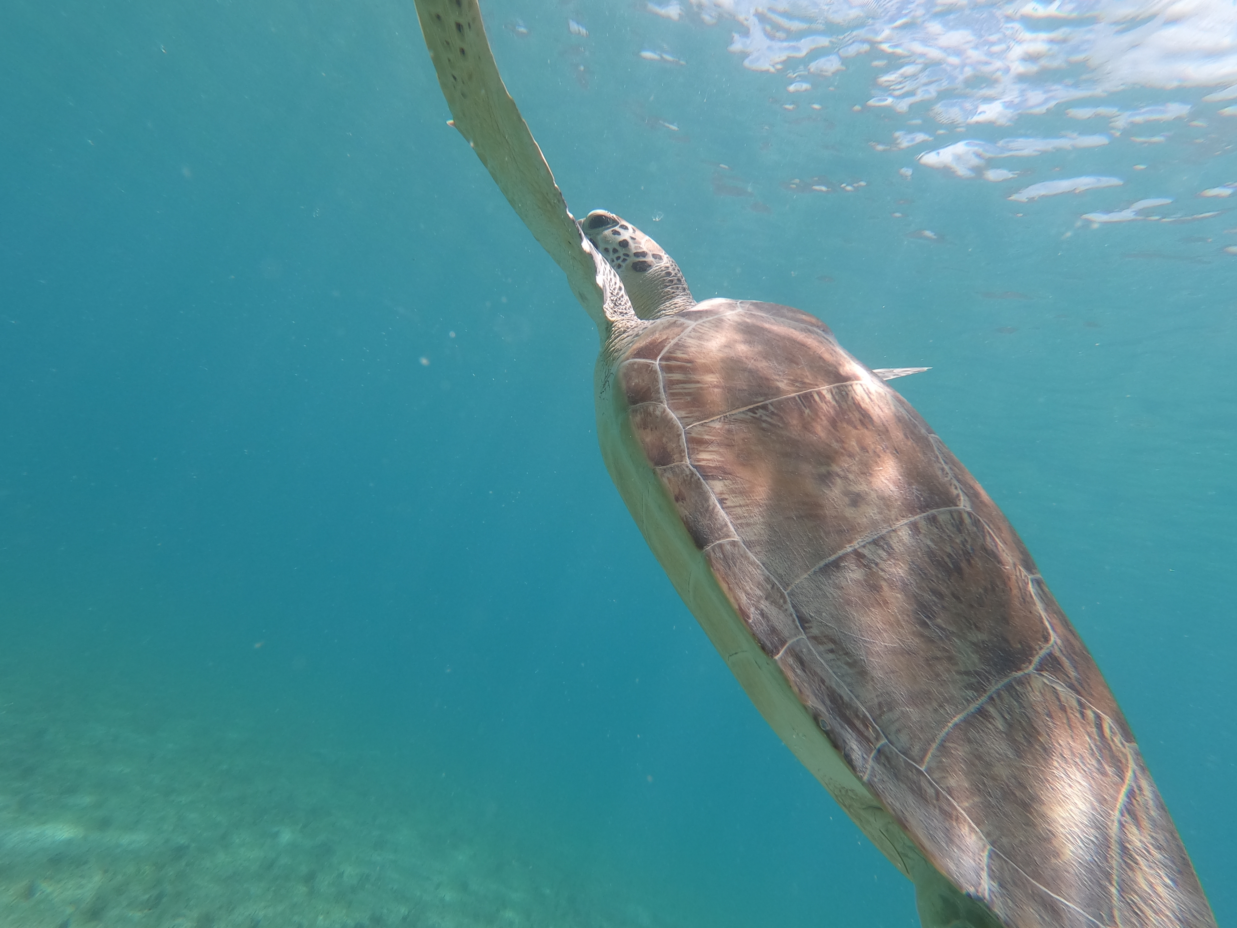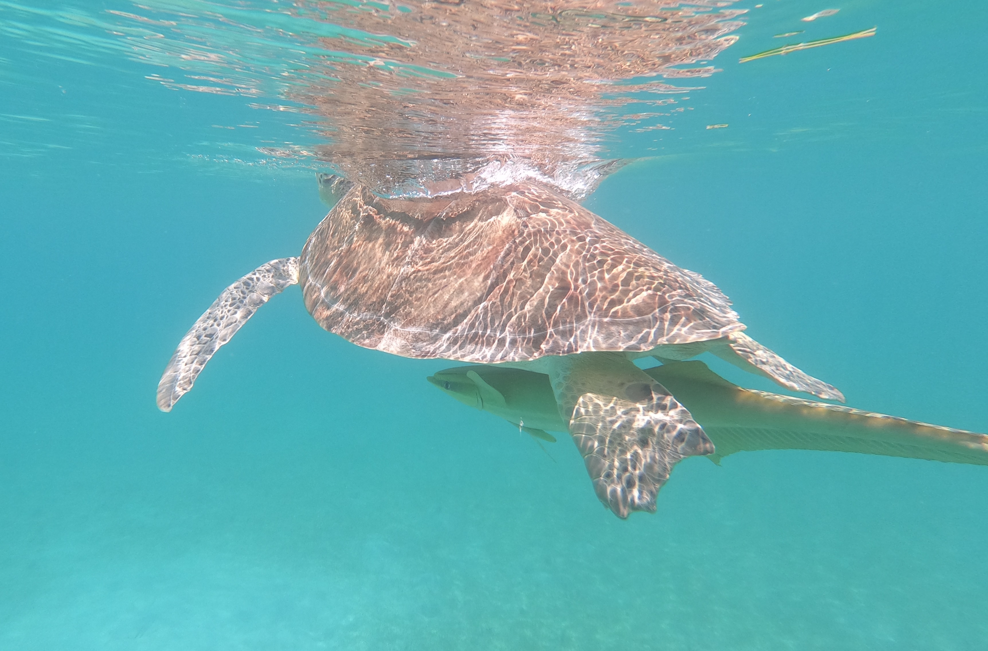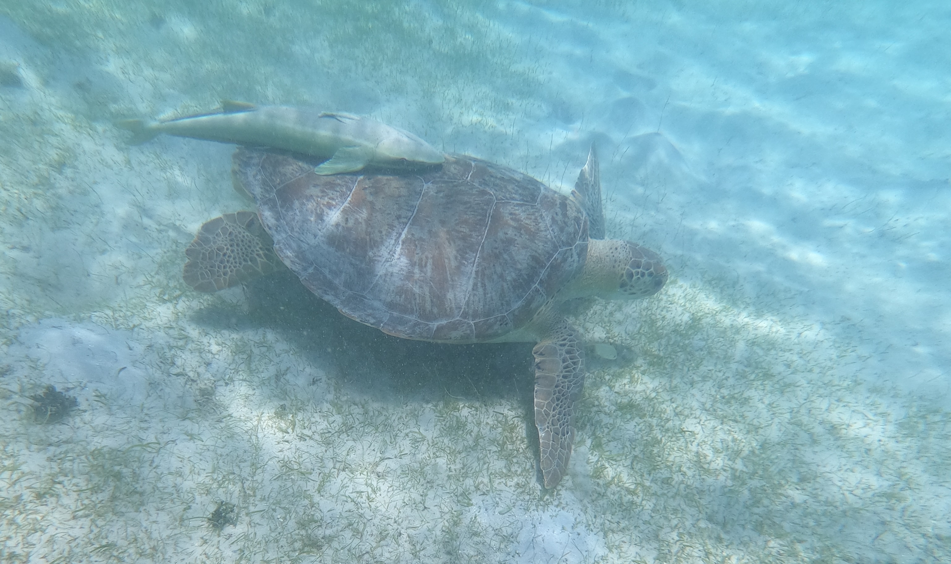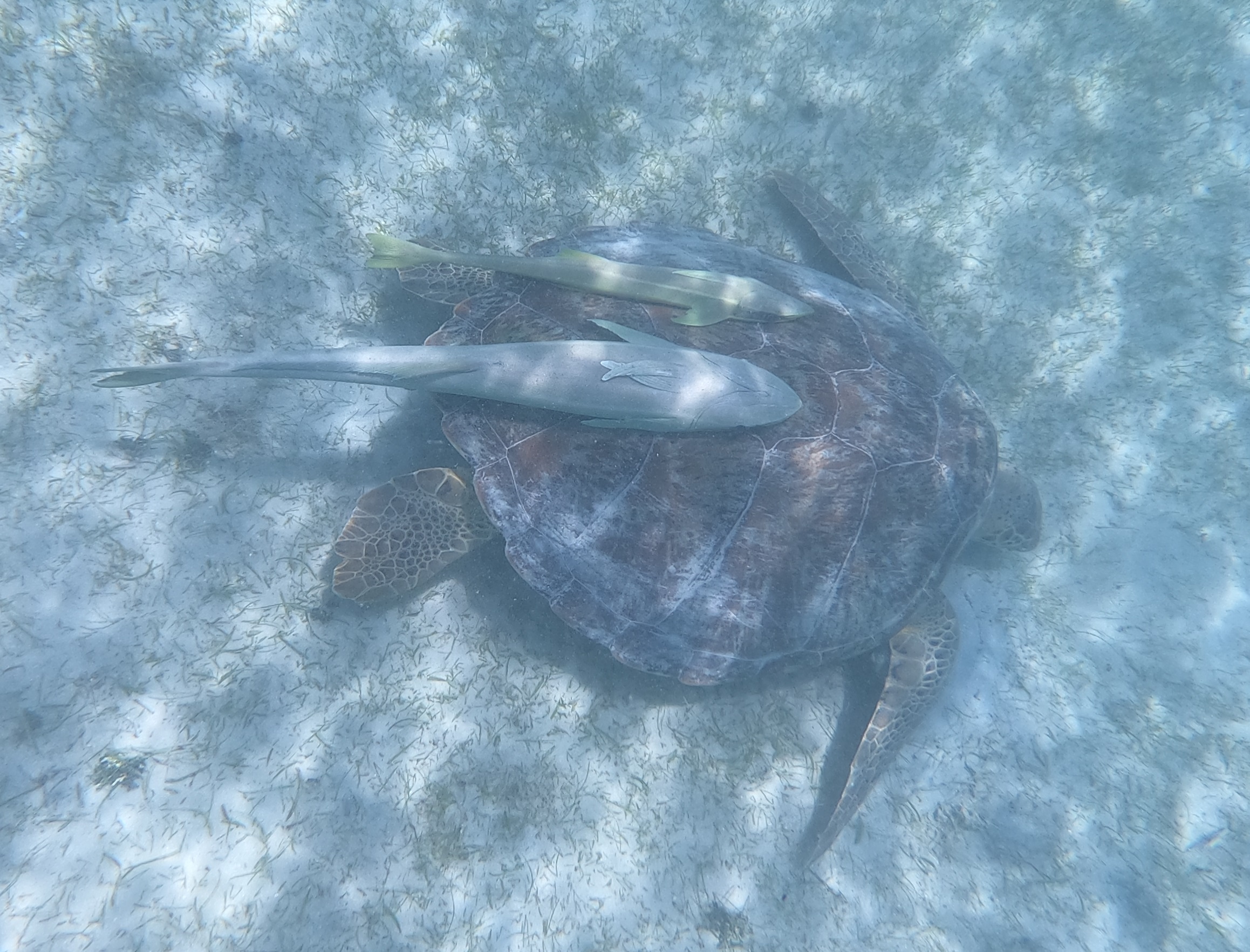 An den Schildkröten haben sich Schiffshalter festgesaugt. Diese Fische sind auch sehr gerne am Rumpf der INVIA – entsprechende Bilder hatte ich schonmal im BLOG gepostet. Mit ihrer großen Saugplatte saugen sie sich fest: Am Unterwasserschiff eines Segelbootes, an Walfischen, manchen Haien oder eben an Schildkröten. Im Video oben ist gut zu sehen wie sich der Fisch dazu auf den Rücken dreht und fest saugt.