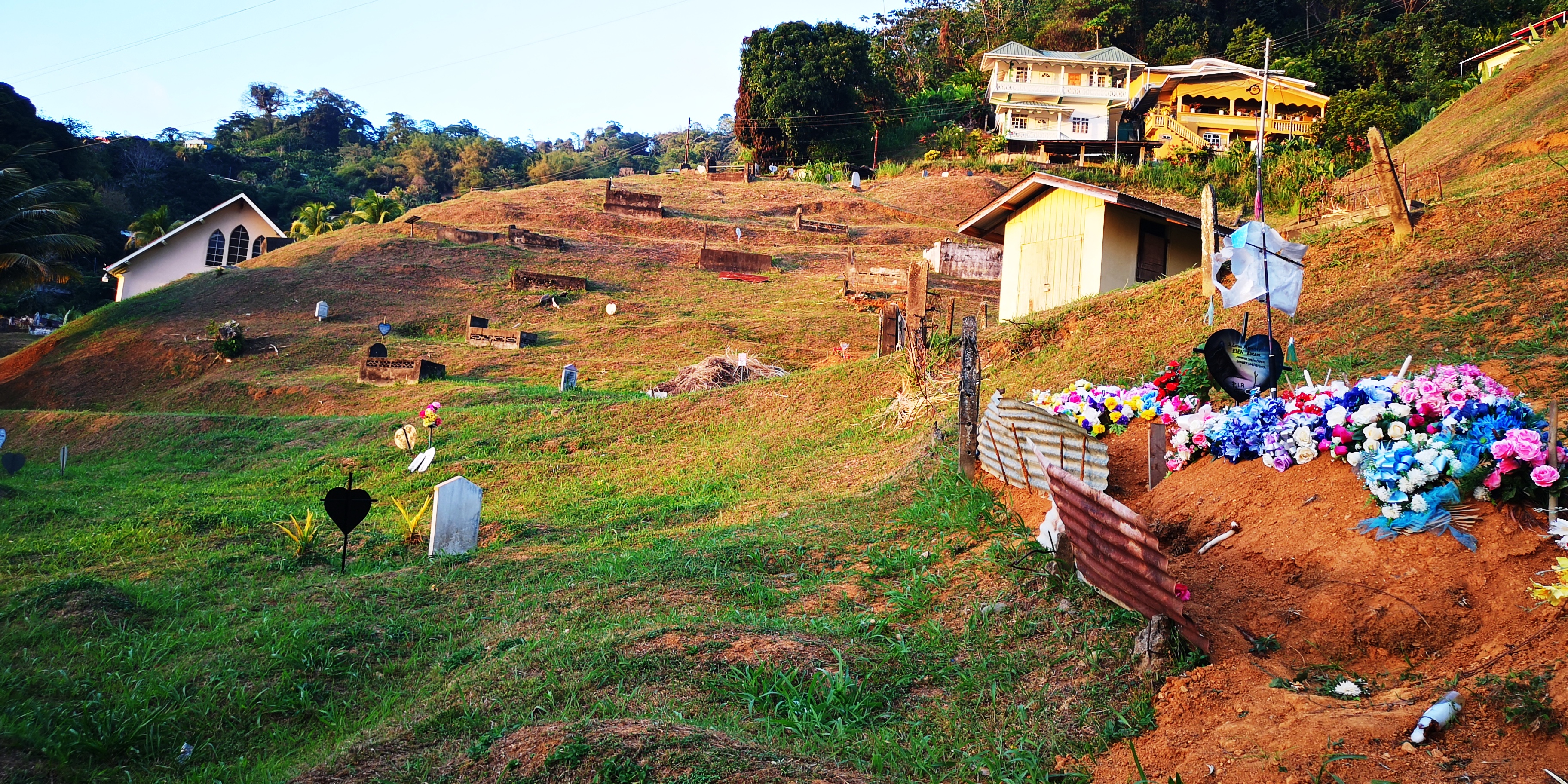 Als wir den Friedhof morgens erreichen, wird gerade die Beerdigung eines 106-jährigen Mannes vorbereitet, des ältesten Einwohners Tobagos. Auf dem Friedhof befinden sich fast ausschließlich Männer, die in der morgendlichen Hitze bereits eifrig rumhaltige Getränke konsumieren. Lohn für die freiwillige Arbeit Grabausschachten, erfahren wir, bezahlt von der Familie des Verstorbenen. Ausgeschachtet wird normalerweise 6 Fuß tief. Zu Ehren des im Ort anerkannten Verstorbenen schachtet man sein Grab 9 Fuß tief aus und das in der Hitze per Schaufel.