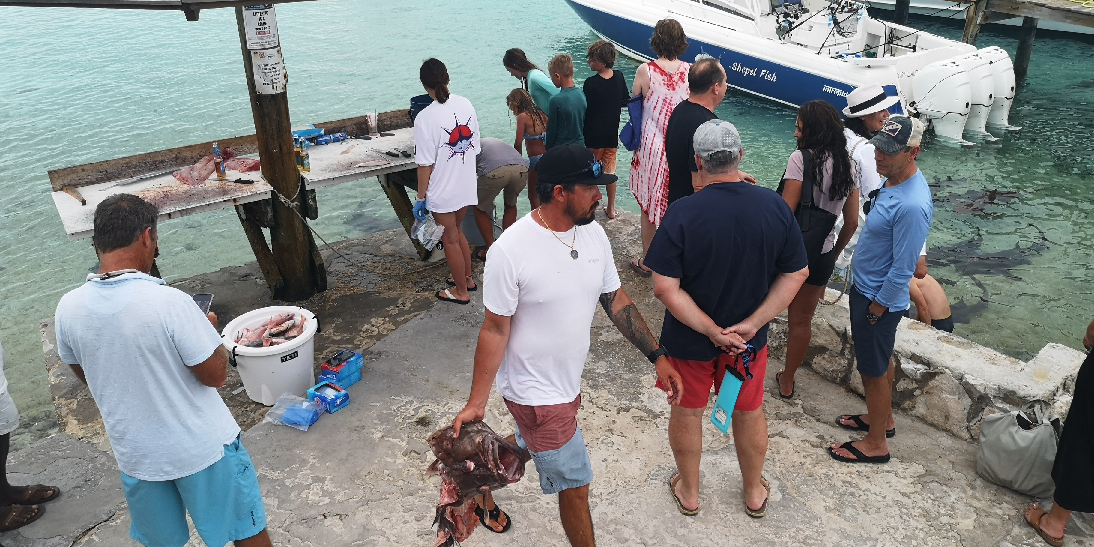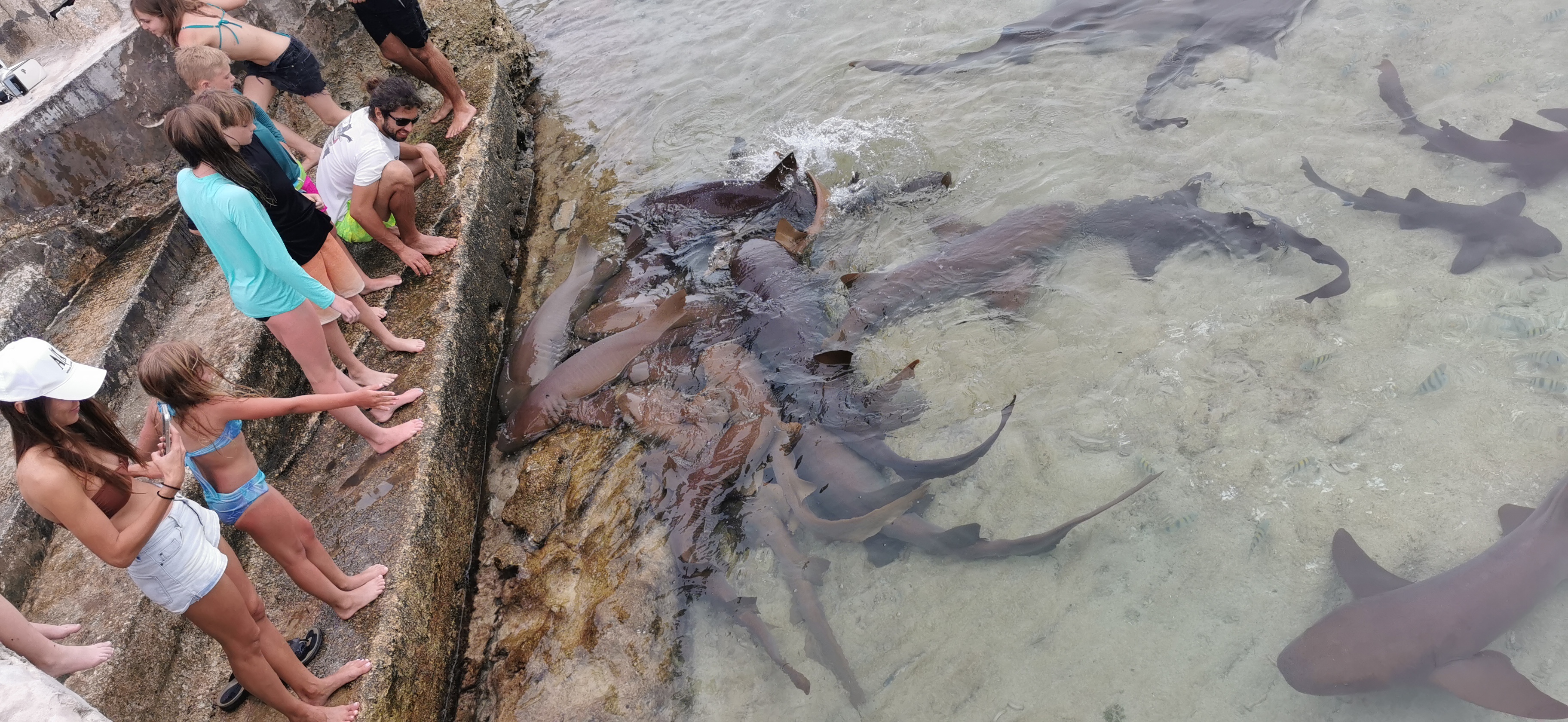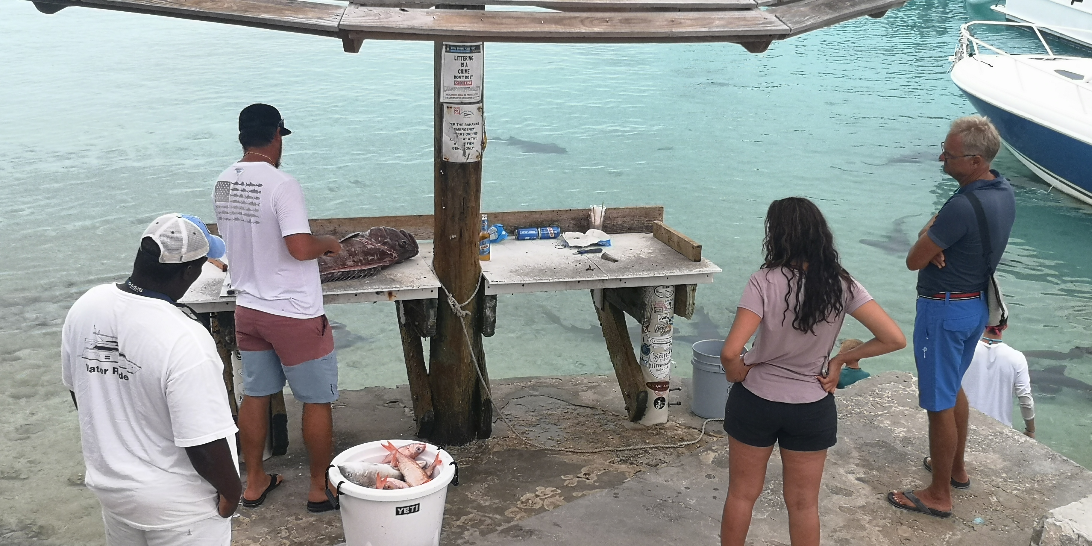 Als wir uns im Staniel Cay Yacht Club einen Drink genehmigen, kommt eines der zahlreichen Sportfischerboote von seinem Jagdausflug zurück. Der Fang – u.a. ein großer Nassau Grouper – wird ausgenommen und die Reste werden an die bereits wartenden Haie verfüttert. Bejubelt von den zahlreichenden anwesenden Touristen. Haie stehen in den Bahamas stehen unter strengem Naturschutz. Es sind faszinierende, majestätische Tiere – aber dieses Schauspiel finde ich widerlich. Trotzdem habe ich es mir angeschaut und gefilmt: