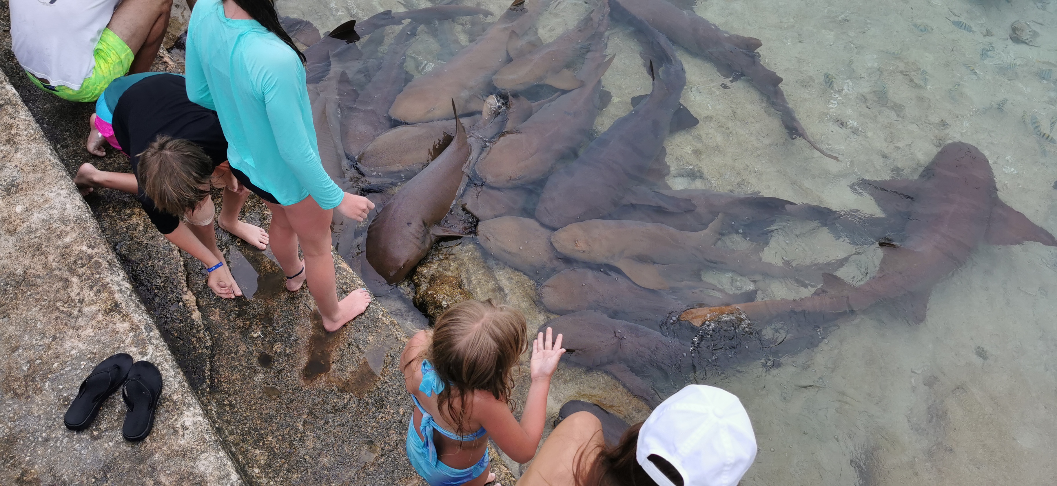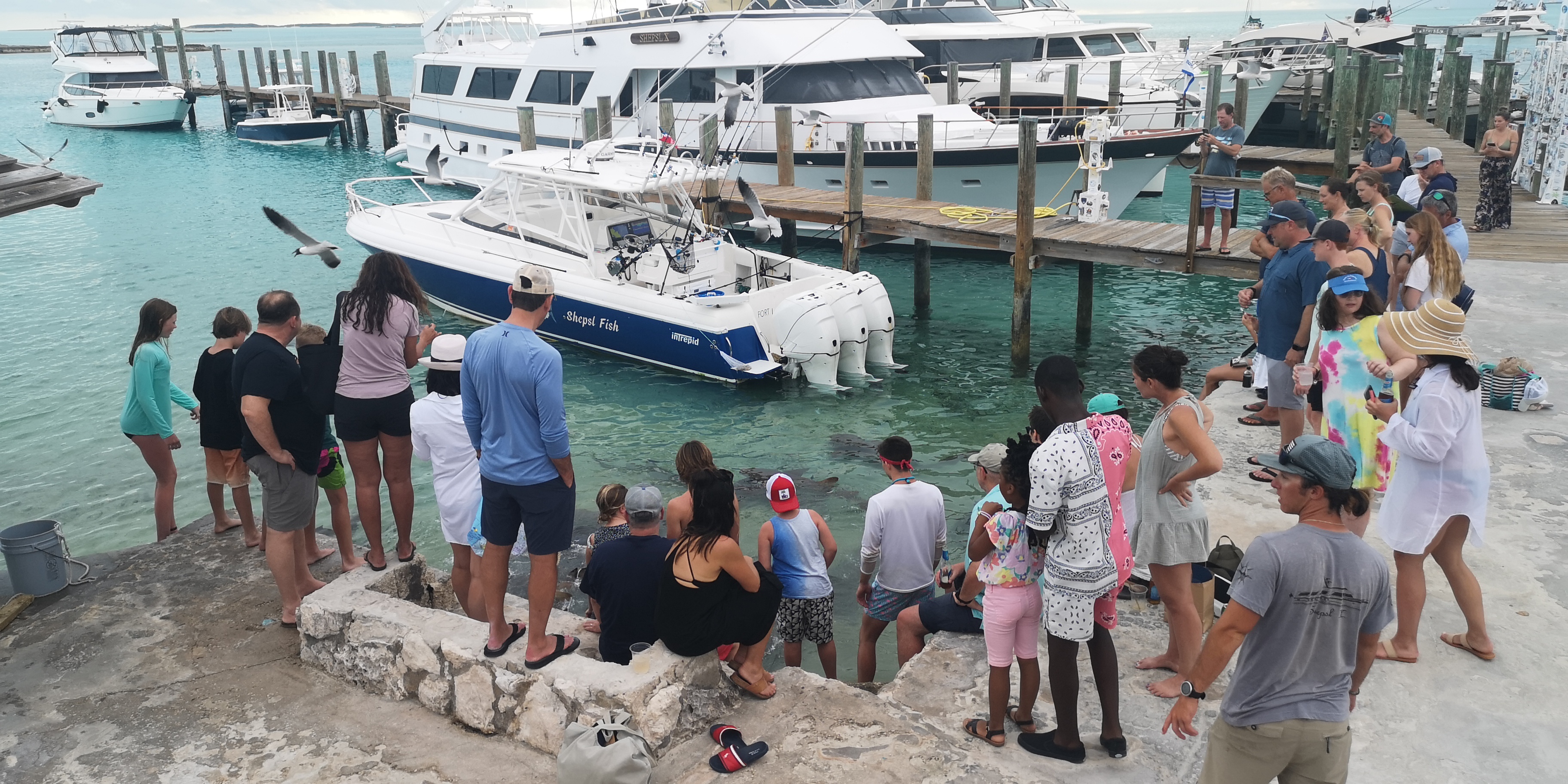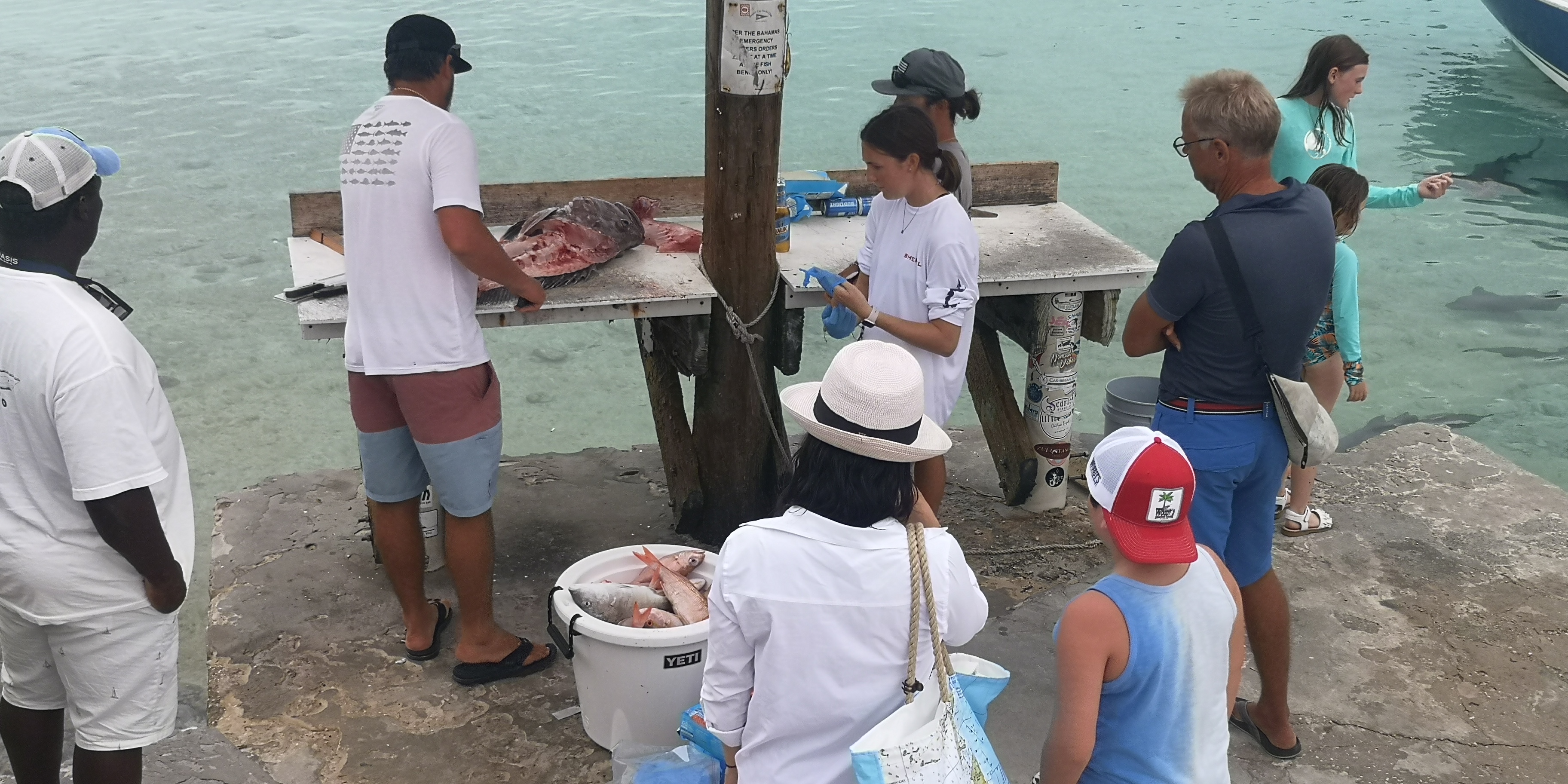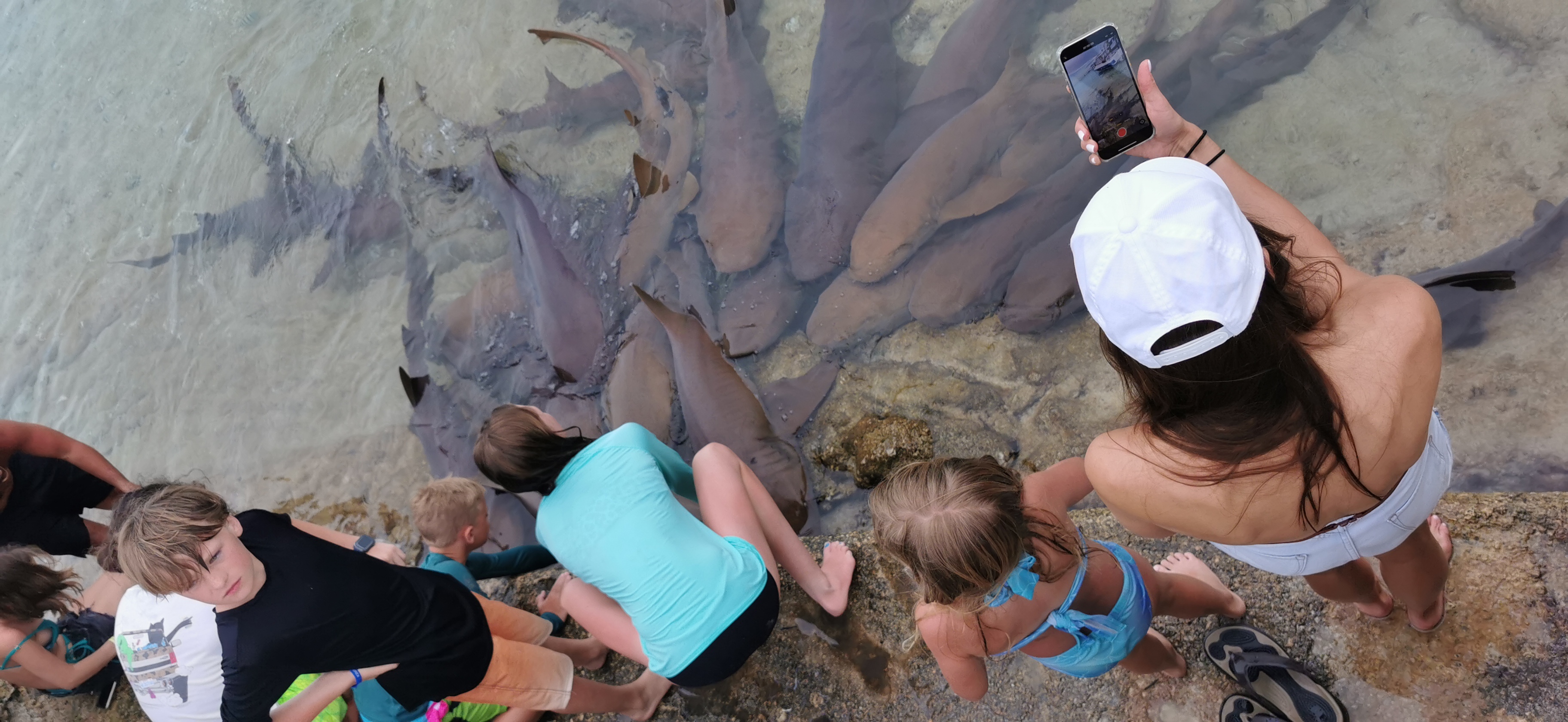 Als wir uns im Staniel Cay Yacht Club einen Drink genehmigen, kommt eines der zahlreichen Sportfischerboote von seinem Jagdausflug zurück. Der Fang – u.a. ein großer Nassau Grouper – wird ausgenommen und die Reste werden an die bereits wartenden Haie verfüttert. Bejubelt von den zahlreichenden anwesenden Touristen. Haie stehen in den Bahamas stehen unter strengem Naturschutz. Es sind faszinierende, majestätische Tiere – aber dieses Schauspiel finde ich widerlich. Trotzdem habe ich es mir angeschaut und gefilmt: